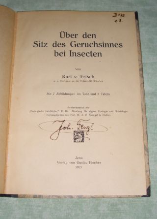 Entomologie – Insektenkunde Frisch, K. von. Über den Sitz des Geruchsinnes bei Insecten. Fischer. Jena. 1921. 68 Seiten. 2 Tafeln. 7 Textabb. Bibliothekshalbleinen der Zeit. Sdr. Zoologische Jahrbücher.