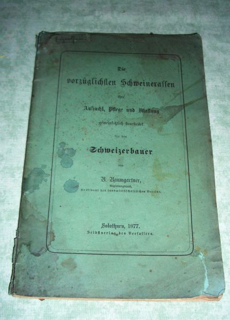 Land- und Forstwirtschaft Baumgartner, B. Die vorzüglichsten Schweinerassen ihre Aufzucht, Pflege und Mastung gemeinfaßlich bearbeitet für den Schweizerbauer. Solothurn. Im Selbstverlag d. Verfassers. 1877. VI. 80 Seiten, 3 Tafeln. OBrosch. Einband fleckig, innen sauber.