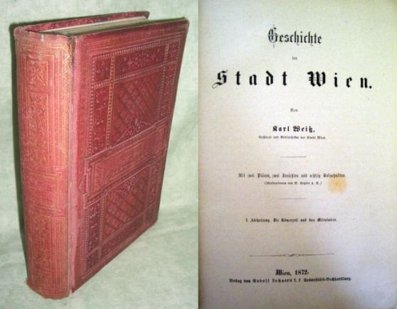 Wien – Landeskunde Weiß, Karl. Geschichte der Stadt Wien. 1. Abtheilung: Die Römerzeit und das Mittelalter. 2. Abtheilung: Die neue Zeit und die Gegenwart. Wien. Rudolf Lechner. 1872. 4 Bl. 278. 417 Seiten, mit zwei Plänen, zwei Ansichten und achtzig Holzschnitten. Blind- und goldgepr. Originalleinen mi marmoriertem Schnitt. Einband stärker berieben, Ecken und Kanten bestossen, innnen sauber und anstreichungsfrei.