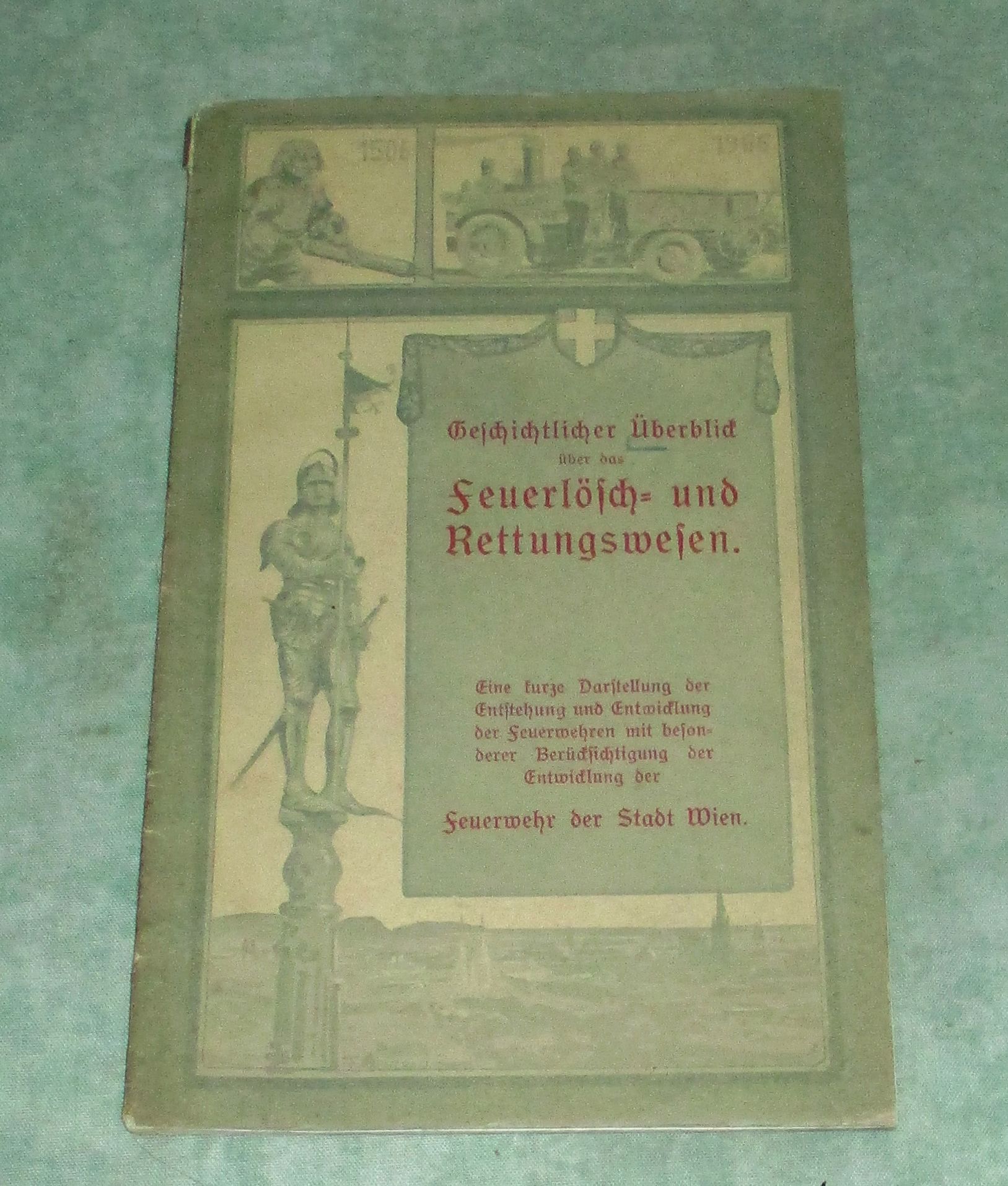Wien – Landeskunde Die Feuerwehr, eine kurze Geschichte ihrer Entstehung und ihrer Entwicklung : Mit besonderer Berücksichtigung der Feuerwehr der Stadt Wien 1906. 49 Seiten, 3 Farbtafeln, 49 Textabb. OBrosch. Umschlagtitel: Geschichtlicher Überblick über das Feuerlösch- und Rettungswesen. Eine kurze Darstellung der Entstehung und Entwicklung der Feuerwehren mit besonderer Berücksichtigung der Entwicklung der Feuerwehr der Stadt Wien.