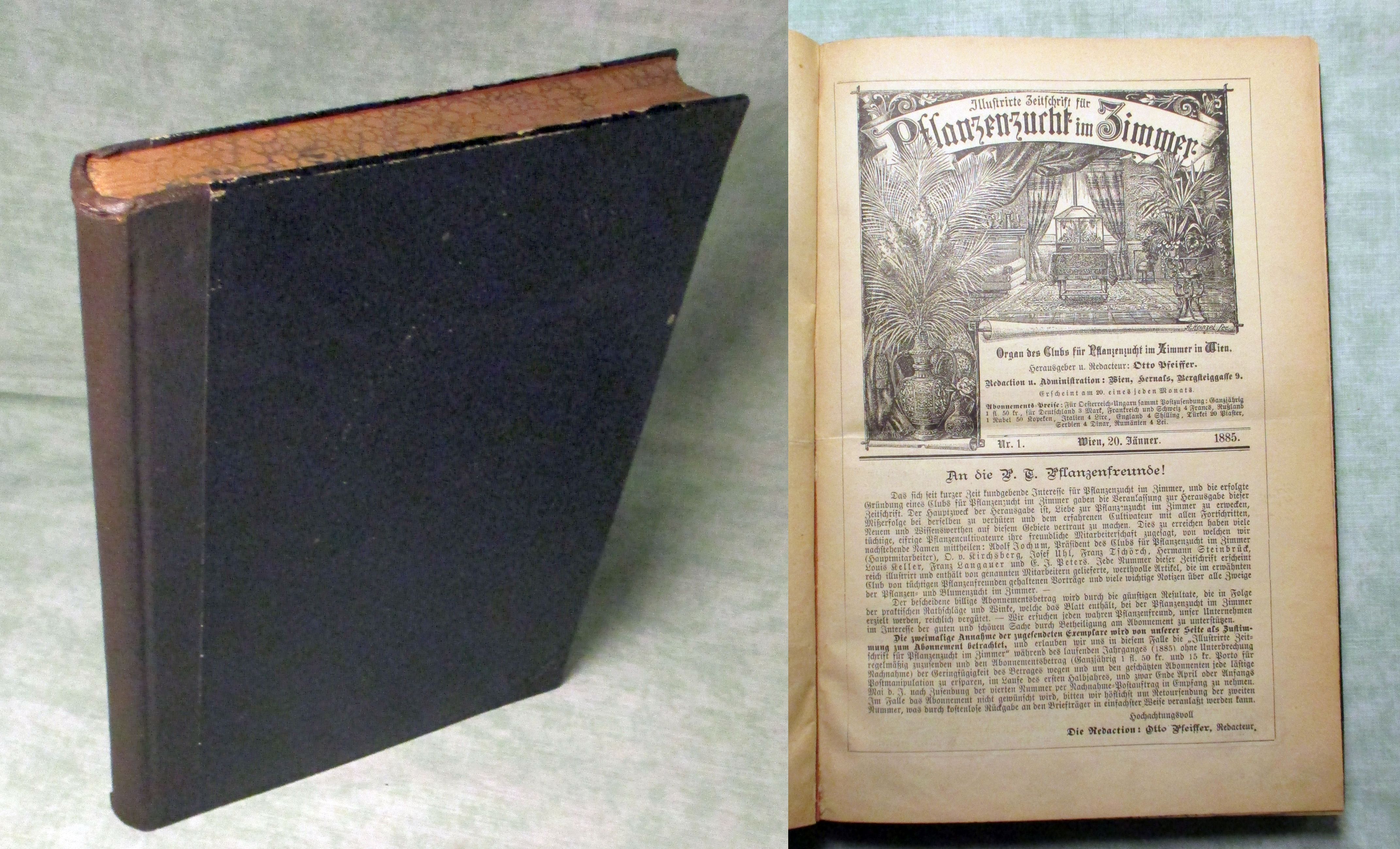Botanik + Gartenbau Pfeiffer, Otto (Hrsg.) Illustrirte Zeitschrift für Pflanzenzucht im Zimmer. Organ des Clubs für Pflanzenzucht im Zimmer. Jahrgänge 1- 3 in einem Band gebunden. 1885-1887. jeder Jahrgang mit 142 Seiten. Zahlr. Holzstiche im Text. Halbleinen der Zeit. In sehr gutem Zustand. Komplette Jahrgänge! Beigebunden: Franz Langauer: Anzucht und Cultur im Palmen im Zimmer.