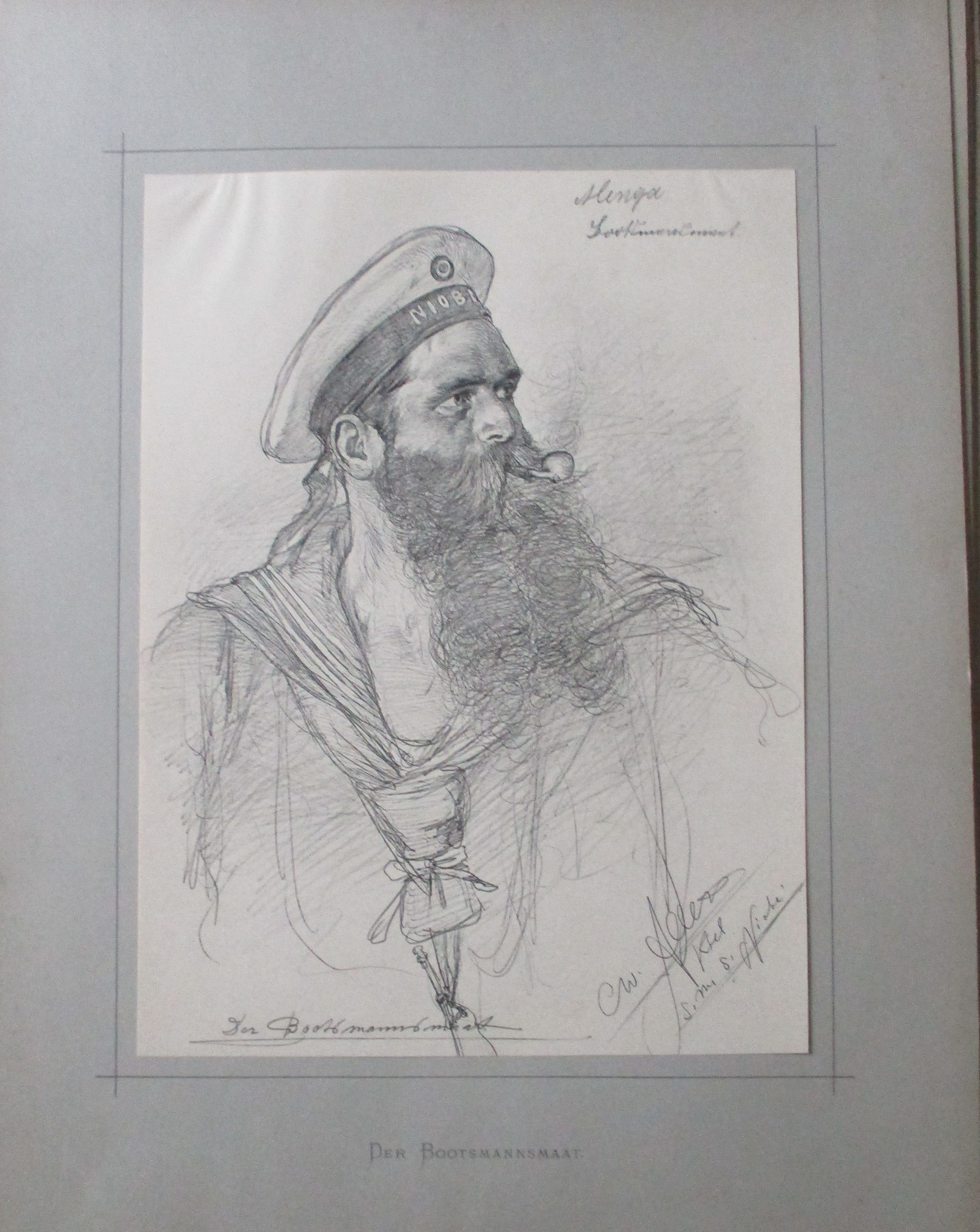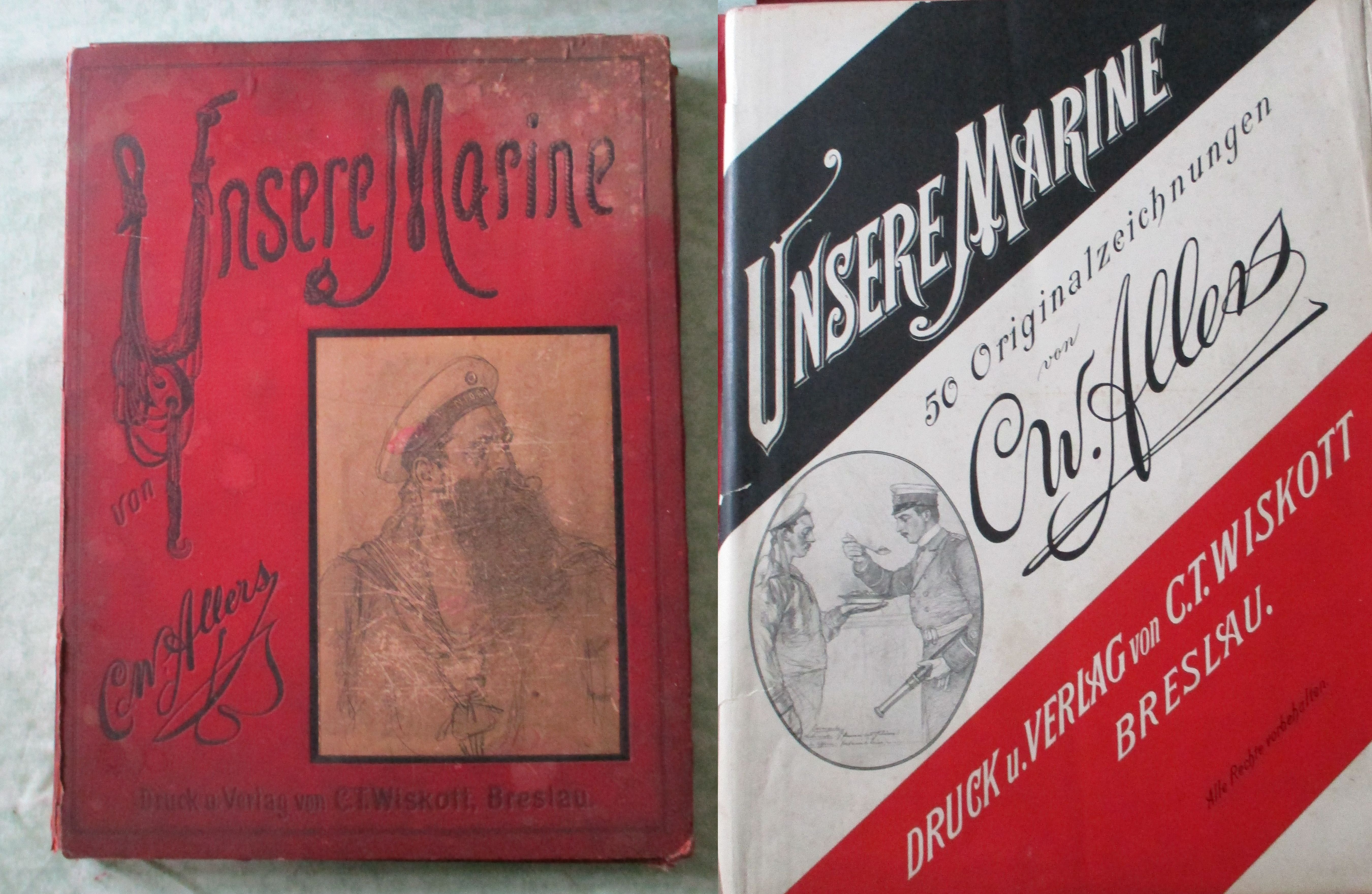 Marinegeschichte – Schiffe + Schifffahrt Allers, Christian Wilhelm. Unsere Marine. Mappe mit 50 auf Tafeln mont. Lichdrucke nach Handzeichnungen von C. W. Allers. (komplett) Breslau C. T. Wiskott, 1891. 32 x 42 cm. 2 Bl. (Titelblatt und Inhaltsverzeichnis) und ca. 40 Tafeln. Mappe mit deutlichen Gebrauchsspuren. (Fleckig, berieben – Titelbild mit Kratzspuren). Zeichnungen in gutem Zustand