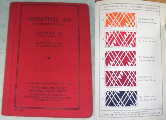 Chemische Technologie I.G. Farbenindustrie Aktiengesellschaft. Naphtol AS im direkten Druck. 38 Seiten Text. 13 Seiten mit 57 eingeklebten Originalfarbmustern. Originalleinen. Gutes Ex. Mit Rezepturen der einzelnen Farben und Anwendungsrichtlinien.