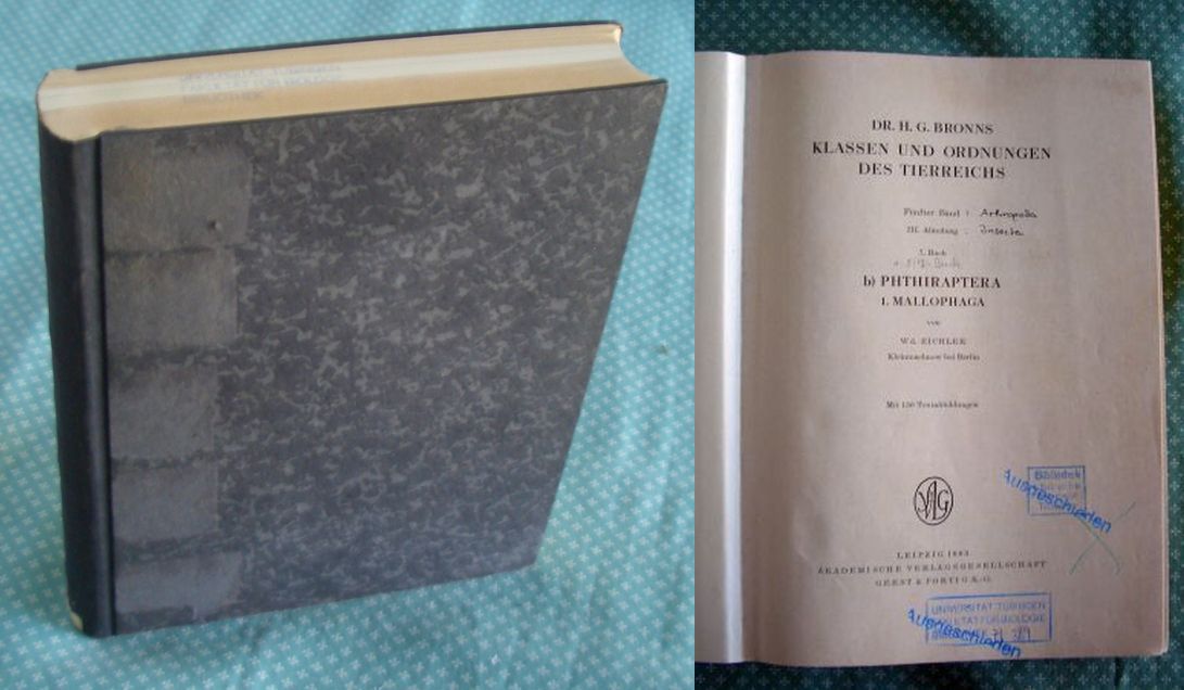 Zoologie Dr. H.G. Bronns Klassen und Ordnungen des Tierreichs. . 5. Band. III. Abteilung. 7. Buch: W. Eichler: Mallophaga. (VII. 290 Seitenn, 150 Textabb.). 8. Buch, Teil b: O. Pflugfelder: Coccina. (121 Seiten, 92 Textabb.). 8. Buch, Teil b: Psyllina (95 Seiten, 75 Textabb.) 13. Buch, Teil f.: Julius Wagner, Aphaniptera (114 Seiten, 100 Textabb) Leipzig. Akademische Verlagsges. 1939-1963. Halbleinen. Exbibliotheksex. mit den entsprechenden Stempeln und Siglen, Einband mit Spuren der entfernten Etiketten.