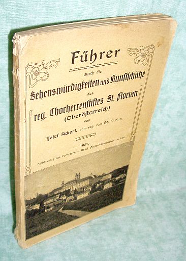 Oberösterreich – Orts- und Landeskunde Ackerl, Josef. Führer durch die Sehenswürdigkeiten und Kunstschätze des reg. Chorherrenstiftes St. Florian (Oberösterreich). Im Selbstverlag d. Verfassers. 1907. 86 Seiten. Einband mit rep. Einriss, ansonsten in gutem Zustand.