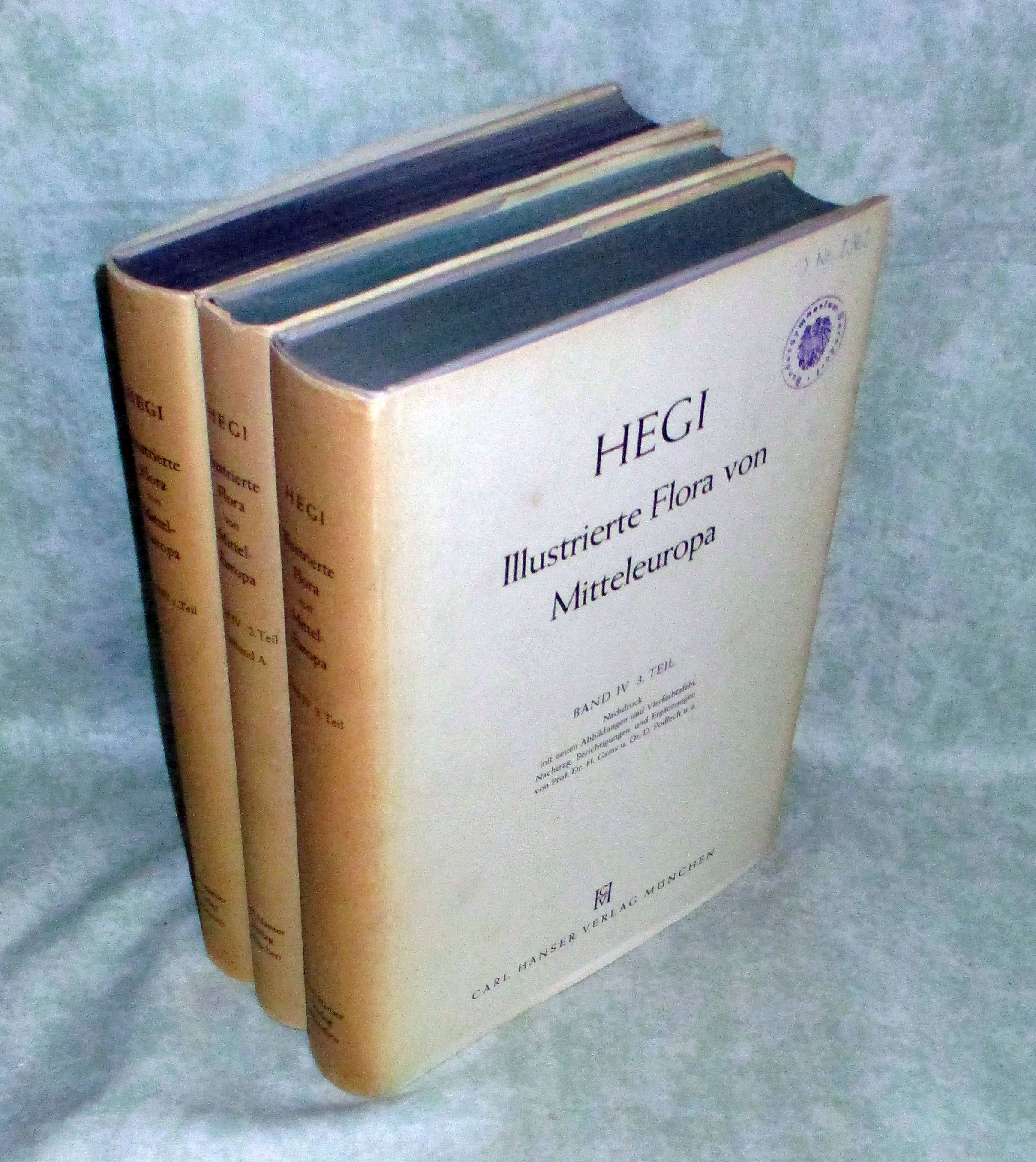 Botanik + Gartenbau Hegi, Gustav. Illustrierte Flora von Mittel-Europa. Mit besonderer Berücksichtigung von Deutschland, Österreich und der Schweiz. Band IV 1-3. Teil.: Dicotyledones 2. Teil. Zweite Auflage, neu bearbeitet und herausgegeben von Friedrich Markgraf unter Mitarbeit von L. Hoerhammer, H. Marzell, E. Oberdorfer, Prof. Dr. Straka u. R. Wannenmacher. 2. völlig neu bearb. Auflage. 3 Bände München. Carl Hanser 1958 – 1964.. ca. 1600 Seiten, 42 farbige Tafeln, 1058 Textabb. und Karten. Leinen mit Schutzumschlag. Schutzumschläge, Einbände und Titelblätter gestempelt,ansonsten einwandfrei.