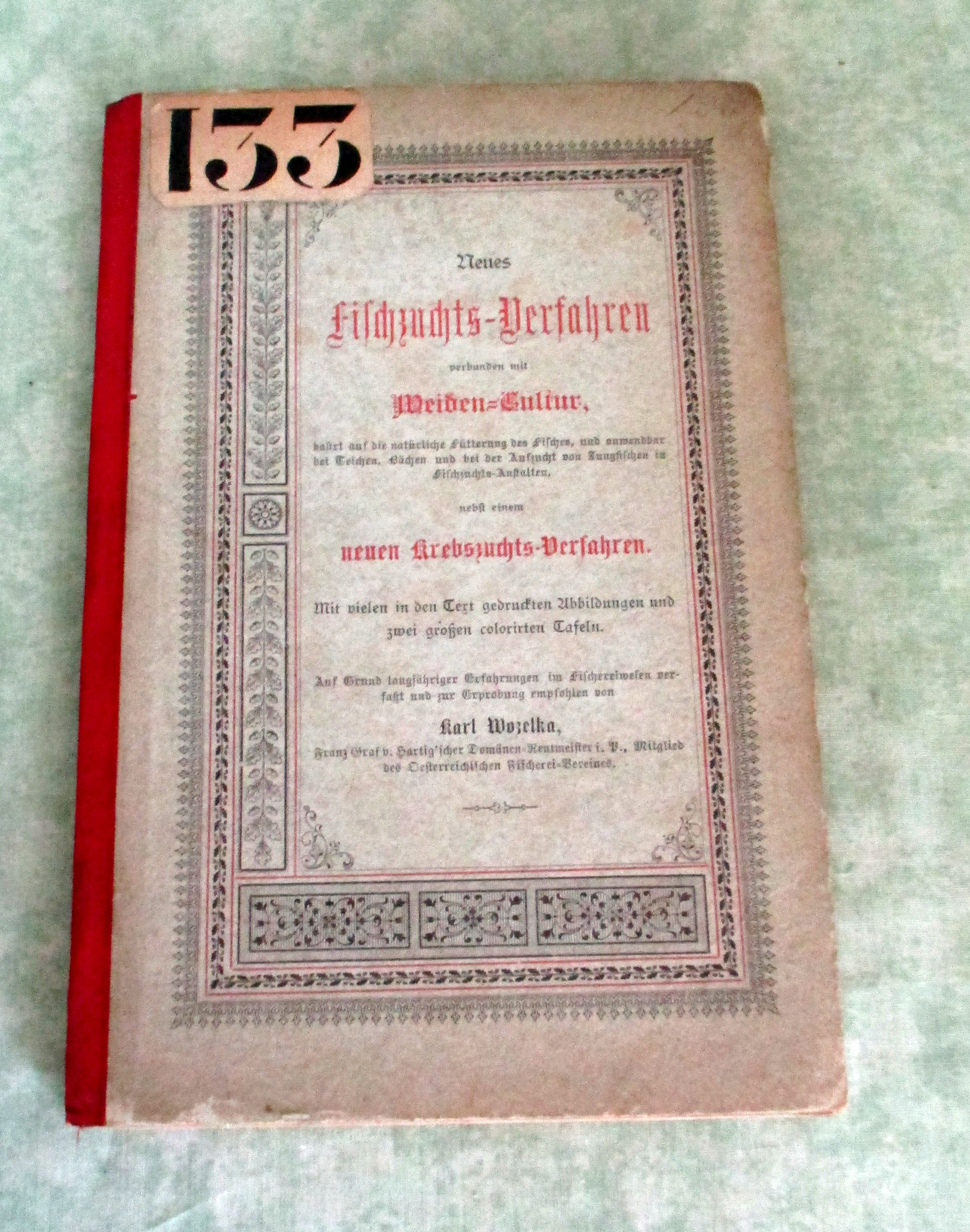 Angeln, Fischerei, Fischzucht Wozelka, Karl: Neues Fischzuchts-Verfahren verbunden mit Weiden-Cultur, basirt auf die natürliche Fütterung des Fisches, und anwendbar bei Teichen, Bächen und bei der AUfzucht von Jungfischen in Fischzuchts-Anstalten, nebst einem neuen Krebszucht-Verfahren. Prag, Haase, 1893. VIII, 90 Seiten, 35 Textabbildungen, 2 ausfaltbare farbige Tafeln. Halbleinen. Ecken un Kanten bestossen. Signatur am Einband. Insgesamt ein gutes Ex.