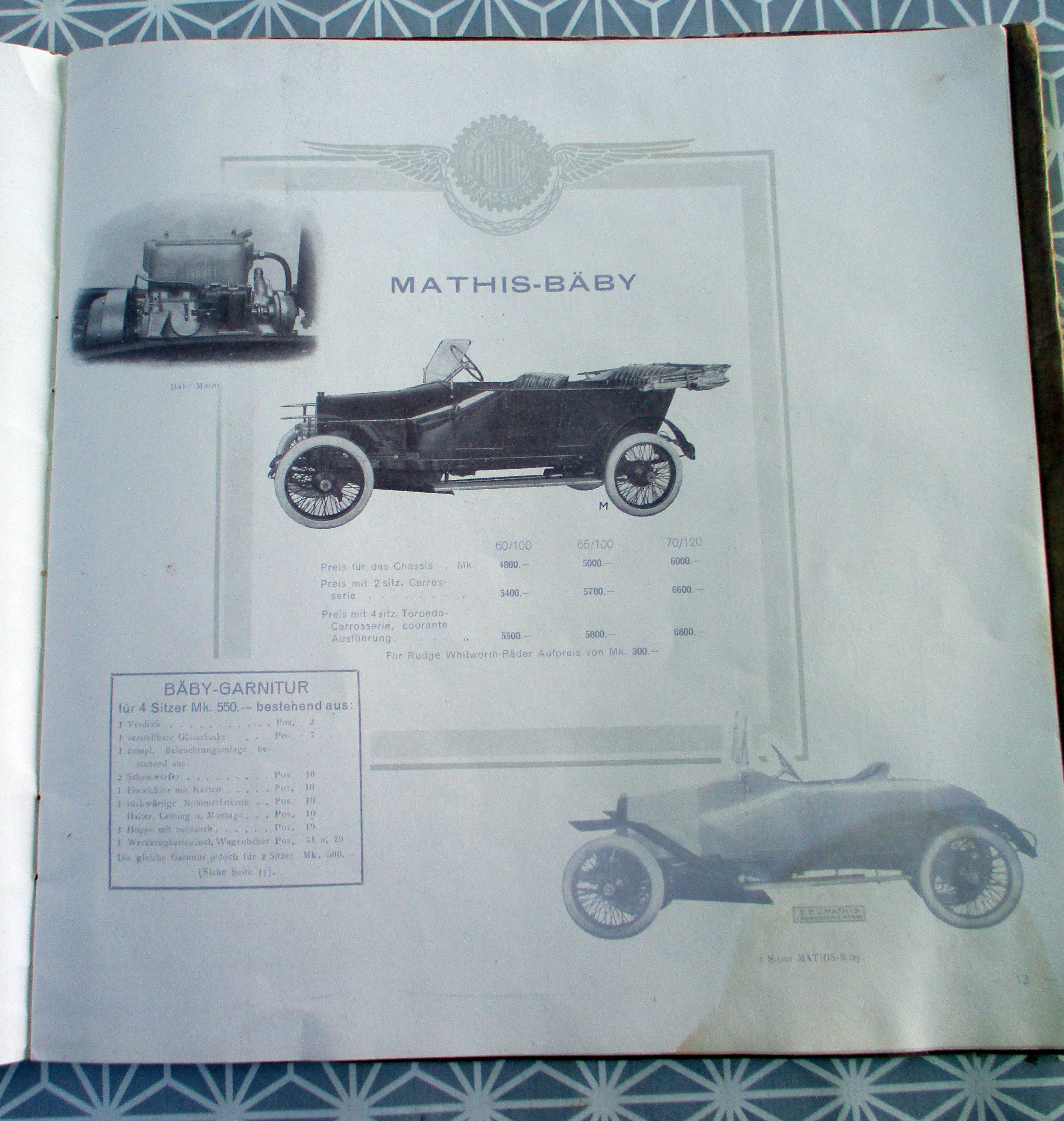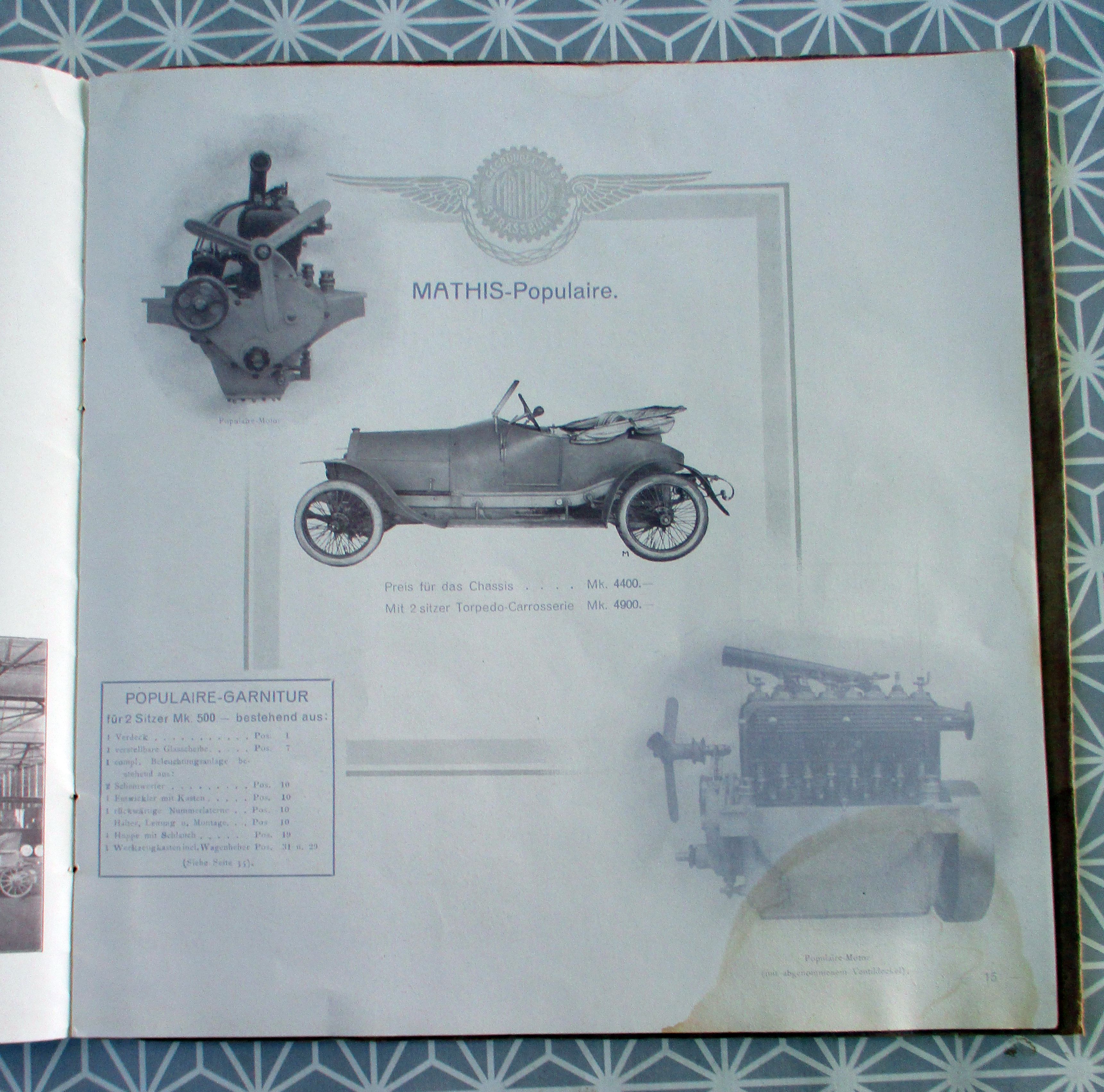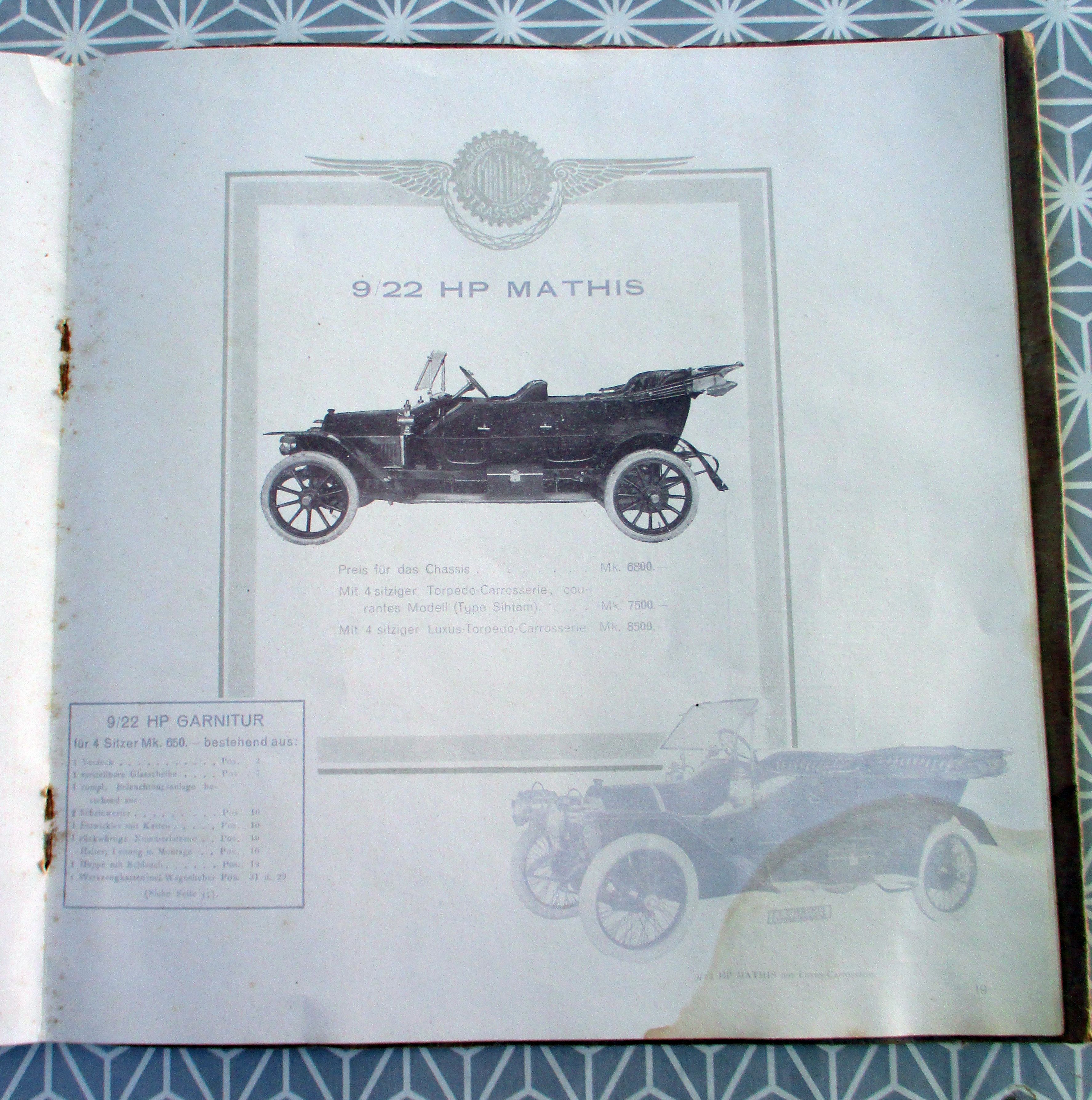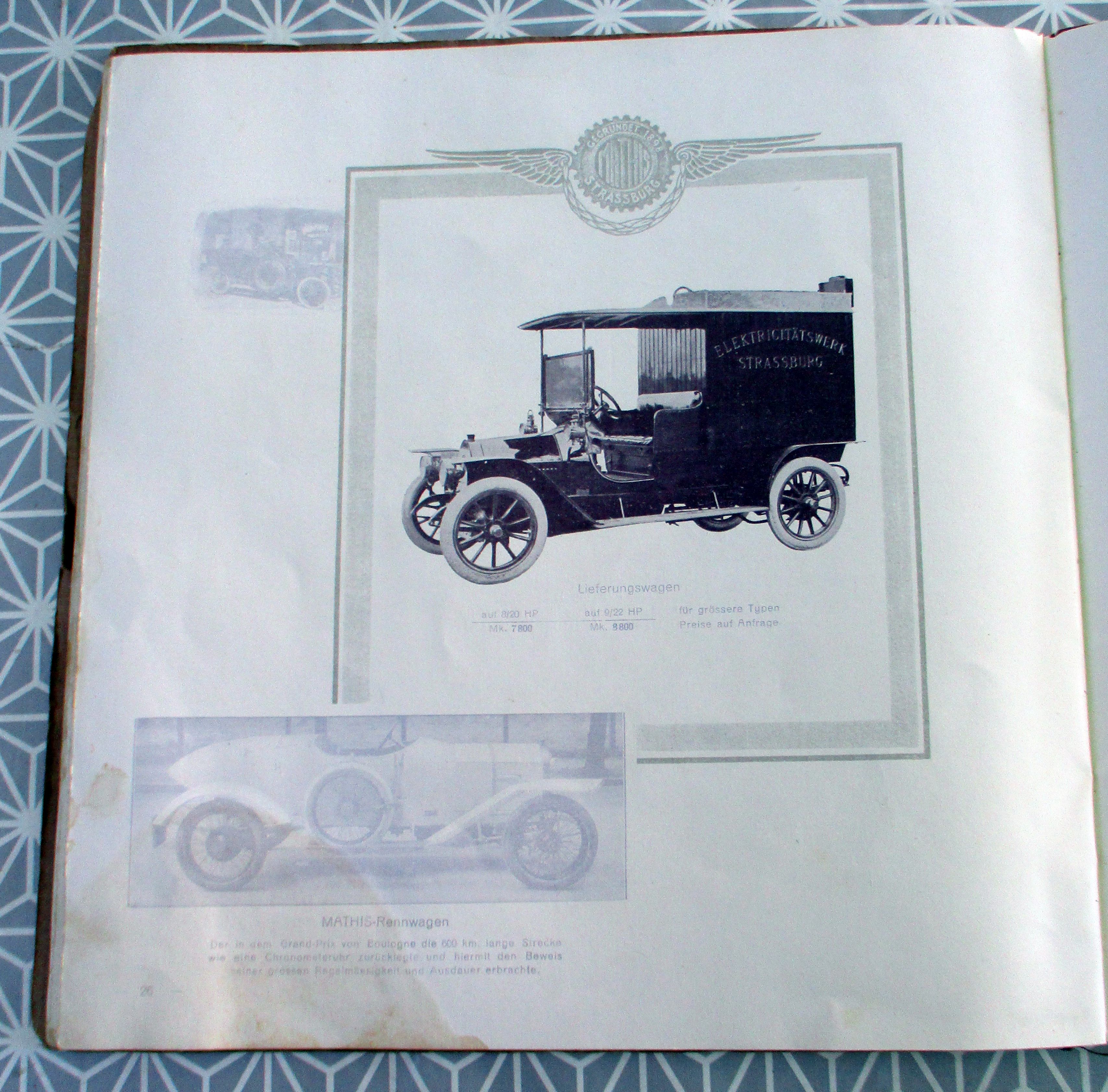 Auto + Motorrad Automobilwerke E.E.C. Mathis Strassburg-Neudorf. Katalog 114. 1912. 24,5 x 24,5 cm. 36 Seiten, zahlr. Abb. der einzelnen Modelle (mit techn. Beschreibungen und Preisangaben) An der rechten unteren Ecke ein Wasserfleck der sich in unterschiedlicher Stärke durch alle Seiten durchzieht. Emil Mathis besaß seit 1898 die Firma Auto-Mathis-Palace, in der er Automobile verkaufte, wartete und reparierte. Seit 1901 hatte er die Generalagentur des Automobilherstellers De Dietrich in Straßburg.