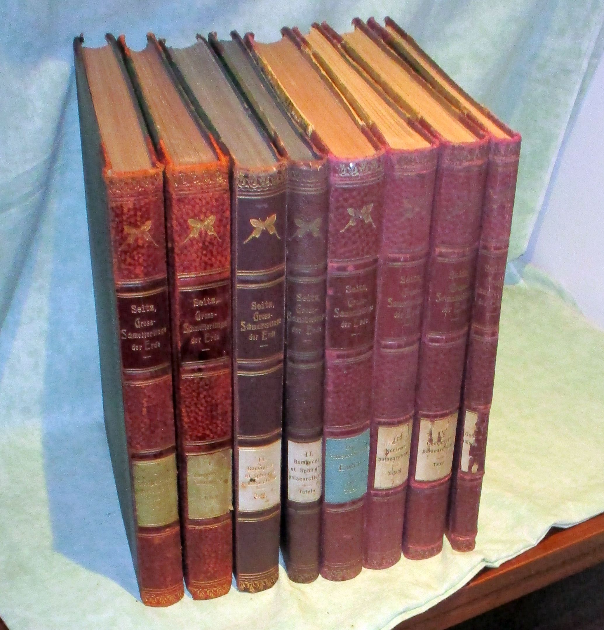 Lepidoptera – Schmetterlinge Seitz, Adalbert, Die Gross-Schmetterlinge der Erde. Eine systematische Bearbeitung der bis jetzt bekannten Gross-Schmetterlinge. I. Abteilung: Die Großschmetterlinge des Palaearktischen Faunengebietes. 1. Band: Die Palaearktischen Tagfalter. 2. Band: Die Palaearktischen Spinner & Schwärmer. 3. Band: Eulenartige Nachtfalter. 8 Bände ( 4 Text- und 4 Tafelbände) Stuttgart. Fritz Lehmann’s Verlag. 1906. Bd. 1: 379 Seiten, 89 Tafeln. Bd. 2: 478 Seiten, 56 Tafeln. Bd. 3: 511 Seiten, 75 Tafeln. Bd. 4: Spannerartge Nachtfalter. 479 Seiten,25 Tafeln. Halbleder. Komplettes Ex. mit allen Tafeln. Zum Teil unterschiedlich gebunden (Leder- und Leinenrücken) Einbände mit kleineren Gebrauchsspuren (Rücken mit Beschabungen, Ecken mit leichten Bestossungen) Bei einem Band einige Seiten mit leichten Ansätzen von Stockflecken und biliographischen Anmerkungen von kundiger alter Hand. Insgesamt ein komplettes Ex. in gutem Zustand. :