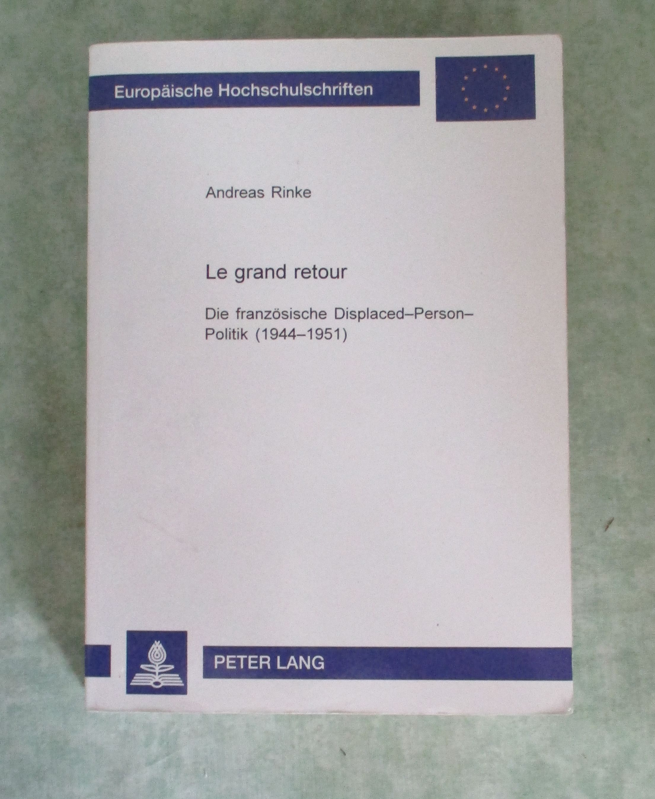 Geschichte + Zeitgeschichte Rinke, Andreas: Le grand retour. Die französische Displaced-Person-Politik (1944 – 1951). Frankfurt am Main/Berlin/Bern/Bruxelles/New York/Oxford/Wien, Lang, 2002. 21 cm. 507 Seiten. Paperback. Auf zahlreichen Seiten Kontraststiftanstreichungen. Europäische Hochschulschriften : Reihe 3, Geschichte und ihre Hilfswissenschaften, Bd. 918.
