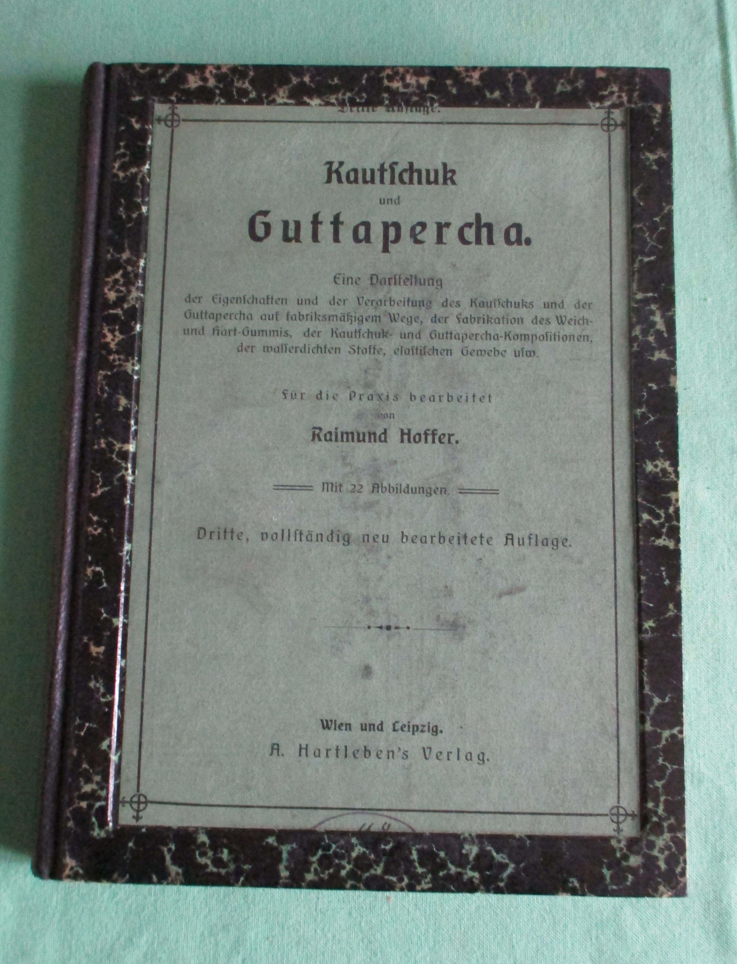 Chemische Technologie Hoffer, Raimund. Kautschuk und Guttapercha. Eine Darstellung der Eigenschaften und der Verarbeitung des Kautschuks und der Guttapercha auf fabriksmäßigem Weg, der Fabrikation des Weich- und Hart-Gummis, der Kautschuk- und Guttapercha-Kompositionen der wasserdichten Stoffe, elastischen Gewebe usw. 3., vollständig neu bearbeitete Auflage. Wien und Leipzig. A. Hartleben’s Verlag. 1908. 238 Seiten. Mit 22 Abbildungen. Späterer Halbleinenband unter Einbeziehung des Originalumschlages A. Hartleben’s chemisch-technische Bibliothek 62. Band.