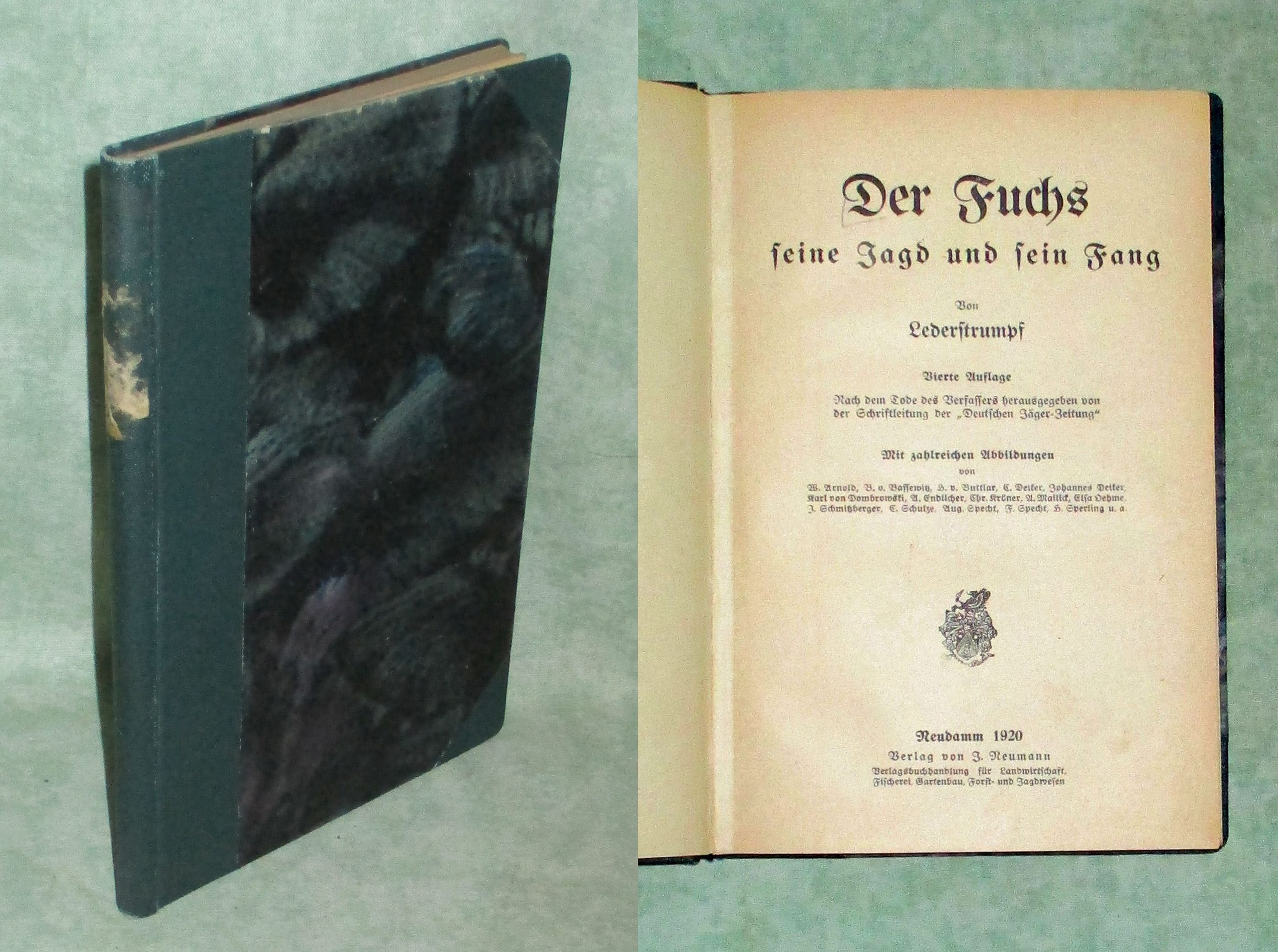 Jagd Lederstrumpf: Der Fuchs. Seine Jagd und sein Fang. Nach dem Tode des Verfassers hrsg. von d. Schriftleitung der „Deutschen Jäger-Zeitung“. 4. Auflage. Neudamm. Neumann. 1920. 128 Seiten, zahlr. Abb.. Bibliothekshalbleinen. Vorsatz mit eingeklebtem Zettel der Coburger Jäger-Bücherei. Ein gutes sauberes Ex.!