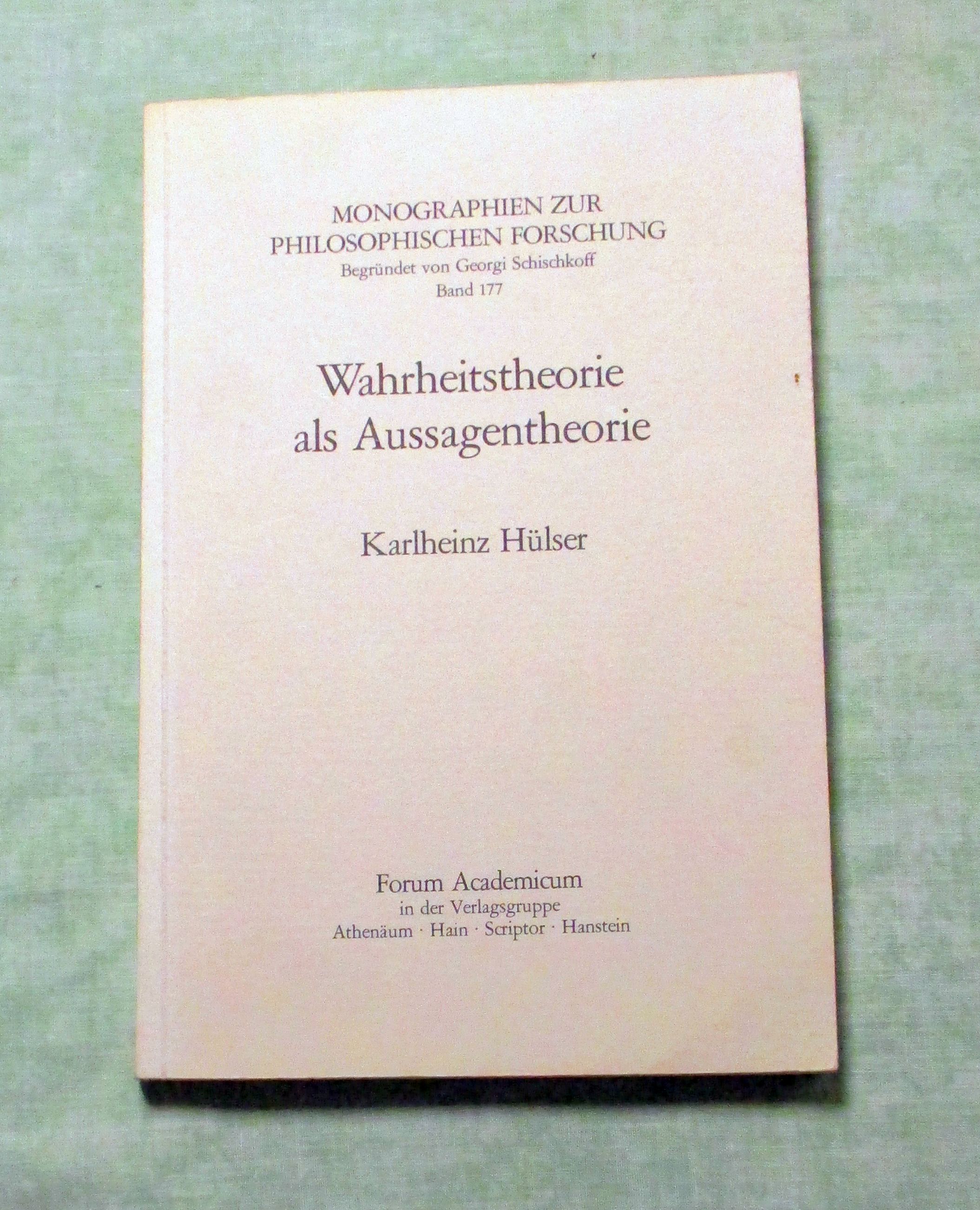 Philosophie Hülser, Karlheinz: Wahrheitstheorie als Aussagentheorie. Untersuchungen zu Wittgensteins Tractatus. Königstein/Ts., Forum Academicum in d. Verlagsgruppe Athenäum, Hain, Scriptor, Hanstein, 1979. 23 cm. X, 244 Seiten. kart. Monographien zur philosophischen Forschung, Bd. 177.
