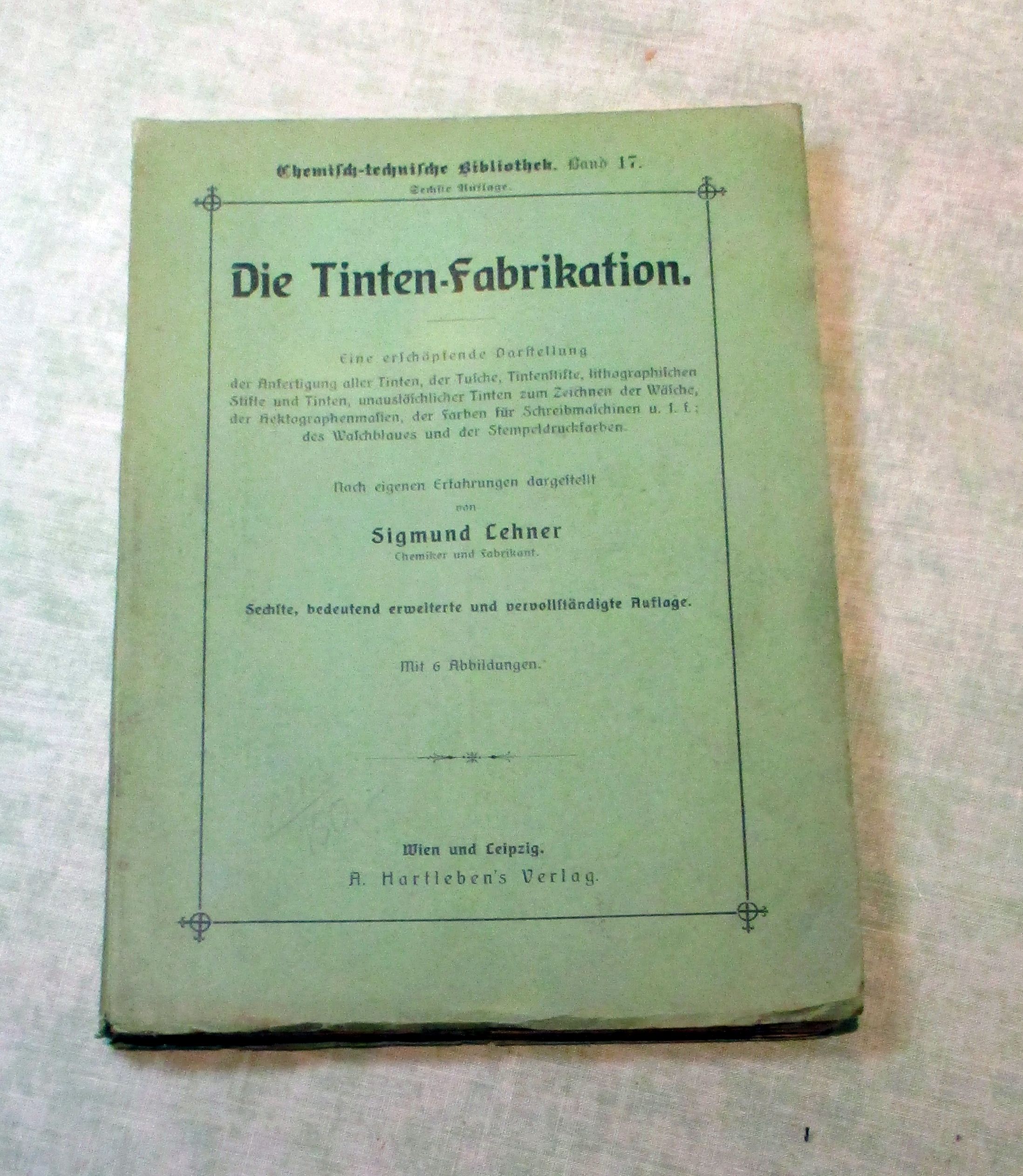 Chemische Technologie Lehner, Sigmund: Die Tinten-Fabrikation. Darstellung d. Anfertigung aller Tinten, d. Tusche, Tintenstifte, lith. Stifte u. Tinten, unauslöschl. Tinten zum Zeichnen d. Wäsche, d. Hektographenmassen, d. Farben f. Schreibmaschinen usf.; d. Waschblaus u. d. Stempeldruckfarben. 6. bedeutend erweiterte und vervollständigete Auflage. Wien/Leipzig, A. Hartleben, 1909. 8. XII, 252 S. Mit 6 Abb. A. Hartlebens chemisch-technische Bibliothek, Bd. 17.