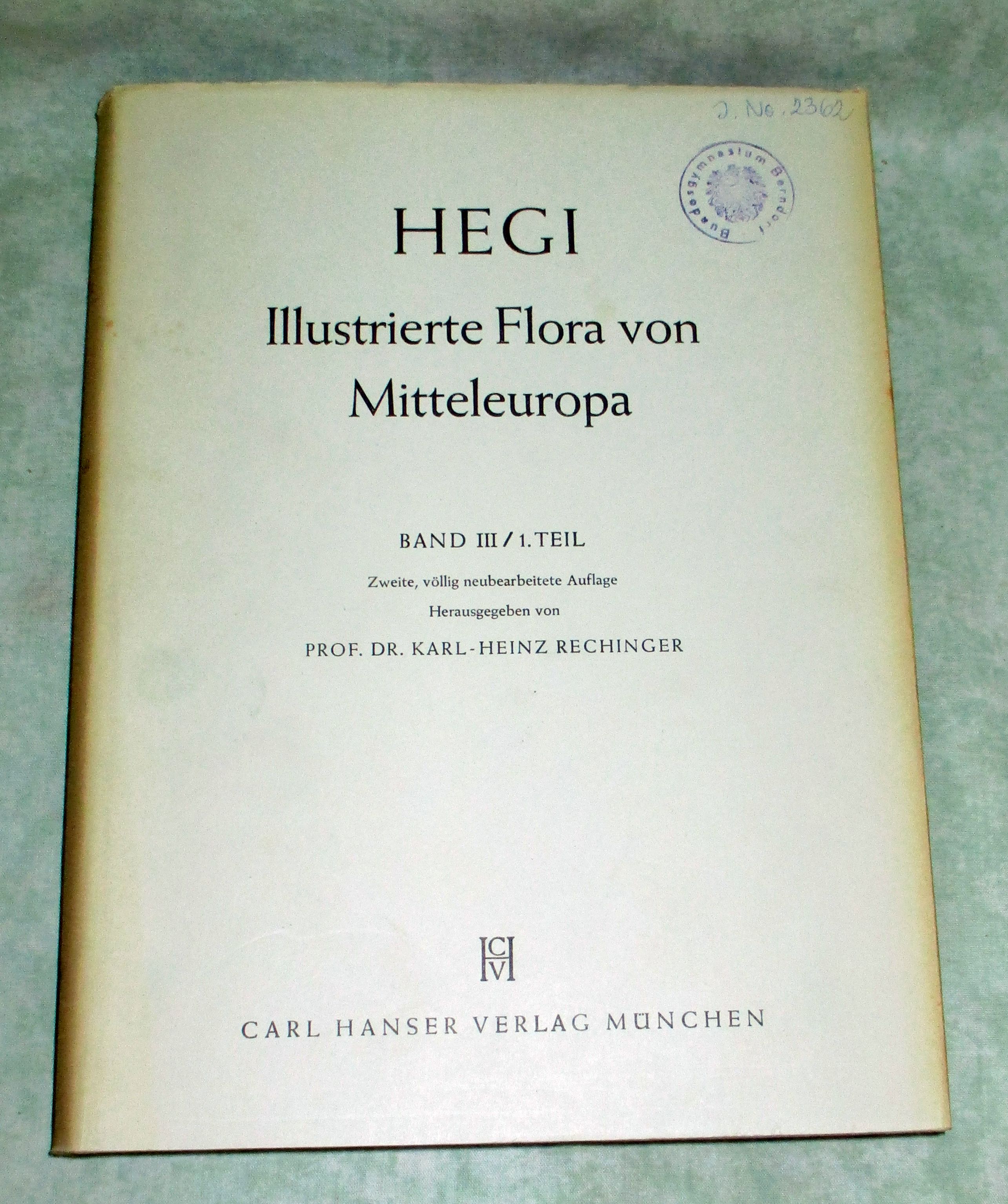 Botanik + Gartenbau Hegi, G. Illustrierte Flora von Mittel-Europa. Mit besonderer Berücksichtigung von Deutschland, Oesterreich und der Schweiz. Zum Gebrauche in den Schulen und zum Selbstunterricht. Band III. Dicotyledones. (I.Teil). Zweite völlig neu bearbeitete Auflage. Carl Hanser. München. 1957. 607 Seiten. Mit 13 farbigen und 4 schwarzen Tafeln. 191 Textabbildungen. Illustrierter Originalleinenband. Schutzumschlag, Einband und Titel gestempelt, ansonsten sauber und anstreichungsfrei.