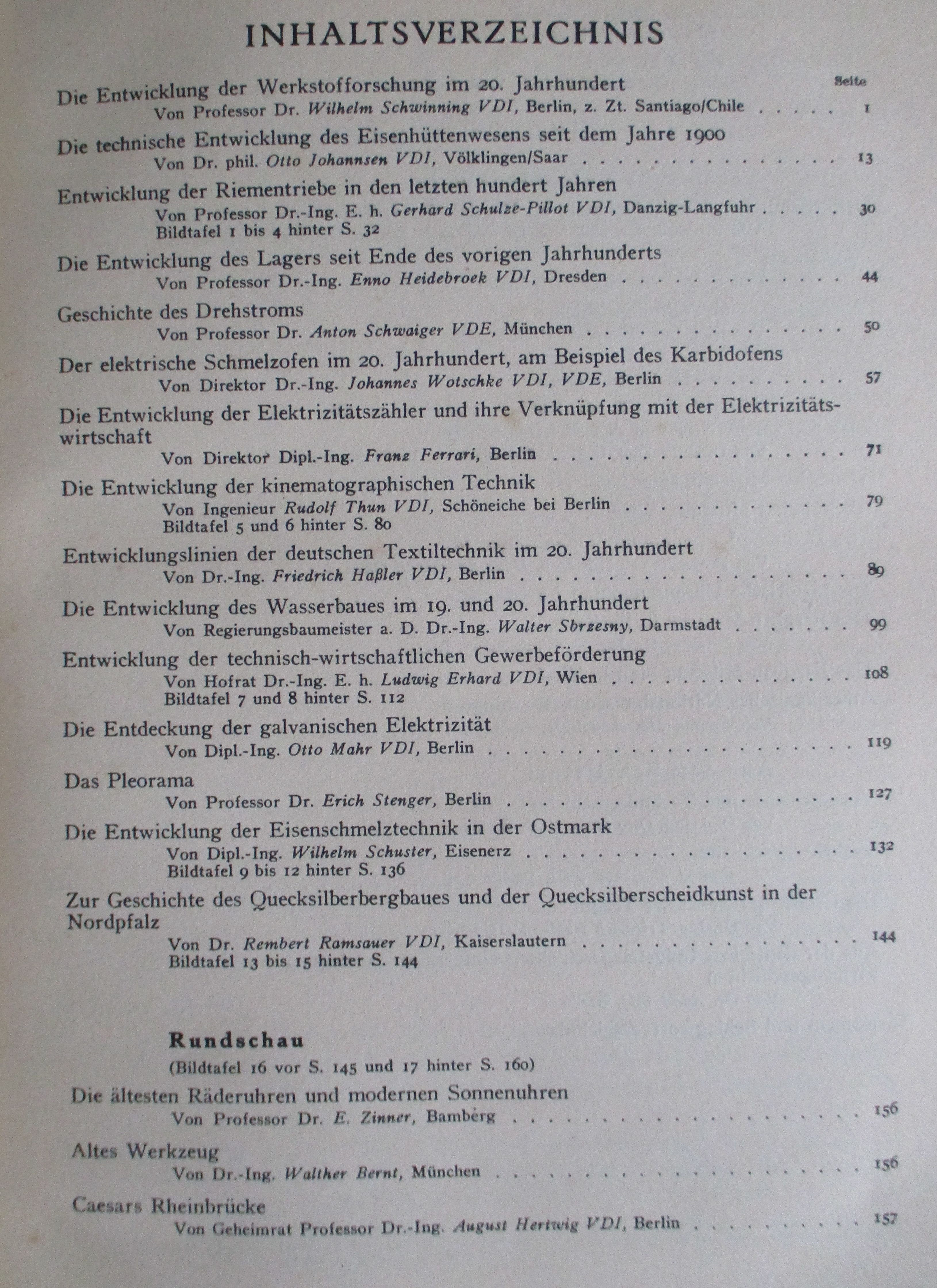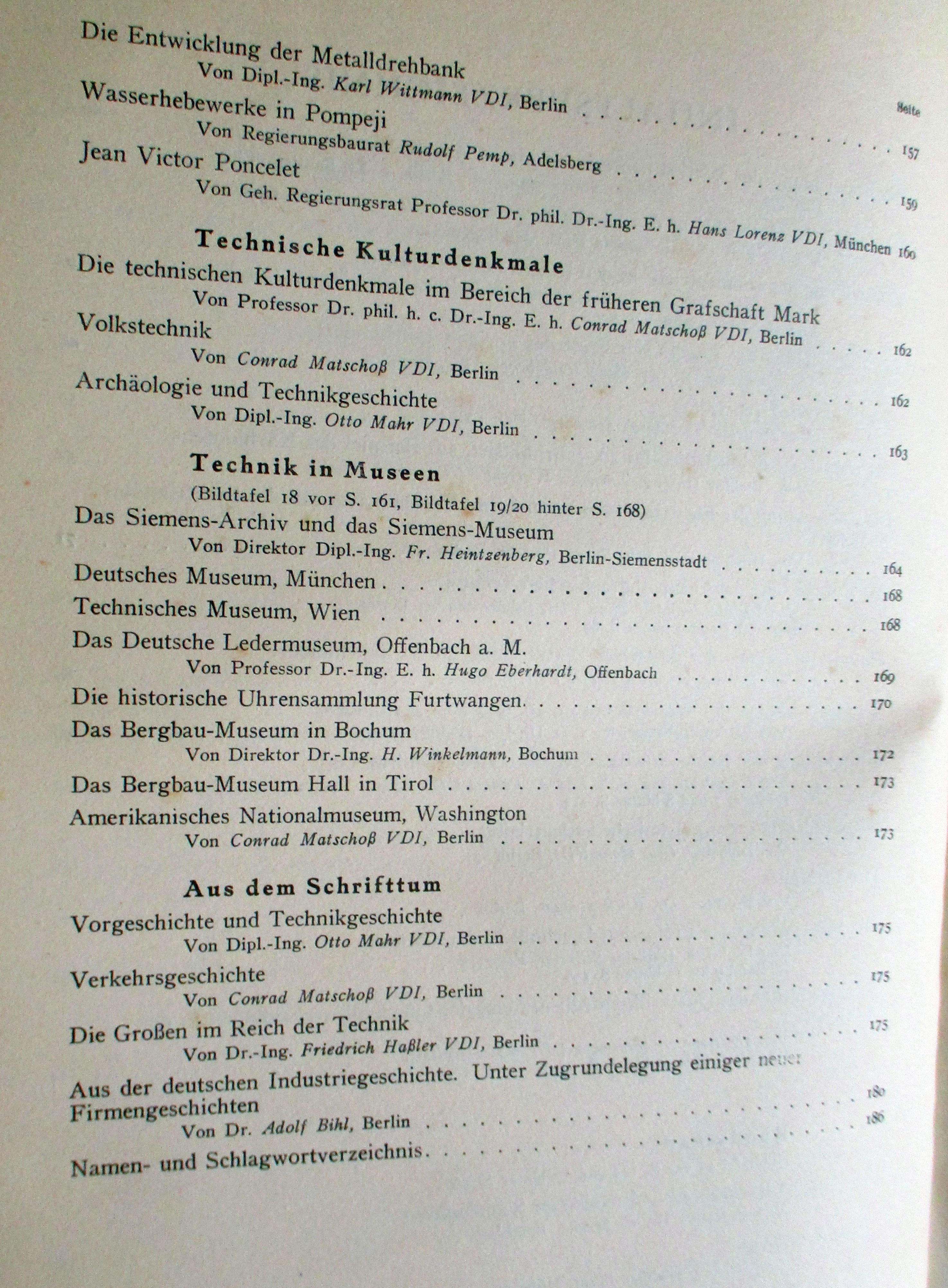 Technik + Technikgeschichte Technikgeschichte. Beiträge zur Geschichte der Technik und Industrie. Bd. 28. Im Auftrage des Vereins Deutscher Ingenieure hrsg. von Conrad Matschoss VDI. 1939. -4°. 188 Seiten. Mit 78 Bildern im Text und auf 20 Tafeln. Originalleinen. Einband leicht fleckig, ansonsten gutes Ex. Aus dem Inhalt: W. Schwinning, Die Entwicklung der Werkstofforschung im 20. Jh. O. Johannsen, Die technische Entwicklung des Eisenhüttenwesens seit dem Jahre 1900. G. Schulze-Pillot, Entwicklung der Riementriebe in den letzten hundert Jahren. E. Heidebroek, Die Entwickluing des Lagers seit Ende des vorigen Jhs. A. Schwaiger, Geschichte des Drehstroms. J. Wotschke, Der elektrischen Schmelzofen im 20. Jh. am Beispiel des Karbidofens. F. Ferrari, Die Entwicklung der Elektrizitätszähler und ihre Verknüpfung mit der Elektrizitätswirtschaft. R. Thun, Die Entwicklung der kinematographischen Technik. F. Haßler, Entwicklungslinien der deutschen Textiltechnik im 20. Jh. W. Sbrzesny, Die Entwicklung des Wasserbaus im 19. und 20. Jh. L. Erhard, Die Entwicklung der technisch-wirtschaftlichen Gewerbeförderung. O. Mahr. Die Entdeckung der galvanischen Elektrizität. E. Stenger, Das Pleorama. W. Schuster, Die Entwicklung der Eisenschmelztechnik in der Ostmark. R. Ramsauer, Zur Geschichte des Qucksilberbergbaues und der Quecksilberscheidekunst in der Nordpfalz.