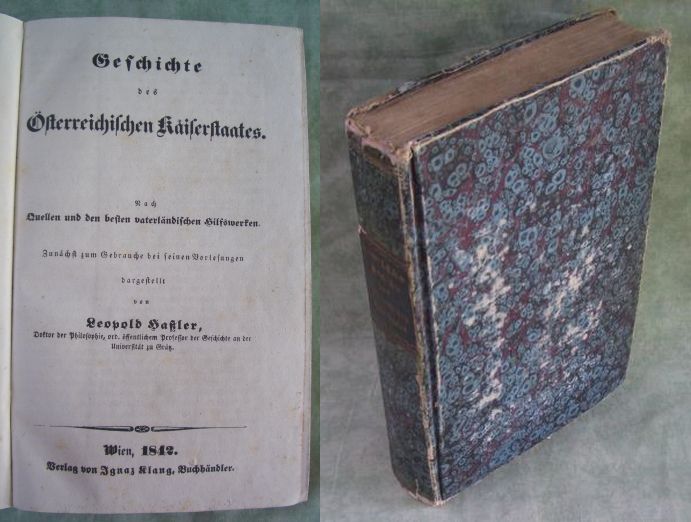 Österreich – Geschichte – Zeitgeschichte Haßler, Leopold: Geschichte des österreichischen Kaiserstaates. Nach Quellen und den besten vaterländischen Hilfswerken. Zunächst zum Gebrauche bei seinen Vorlesungen dargestellt.. Wien. Ignaz Klang. 1842. 508 Seiten.. Originalpappband der Zeit mit goldgepr. Rückenschildchen. Einband berieben, Ecken und Kanten bestossen, innen sauber und stockfleckenfrei. Insgesamt gutes Ex.