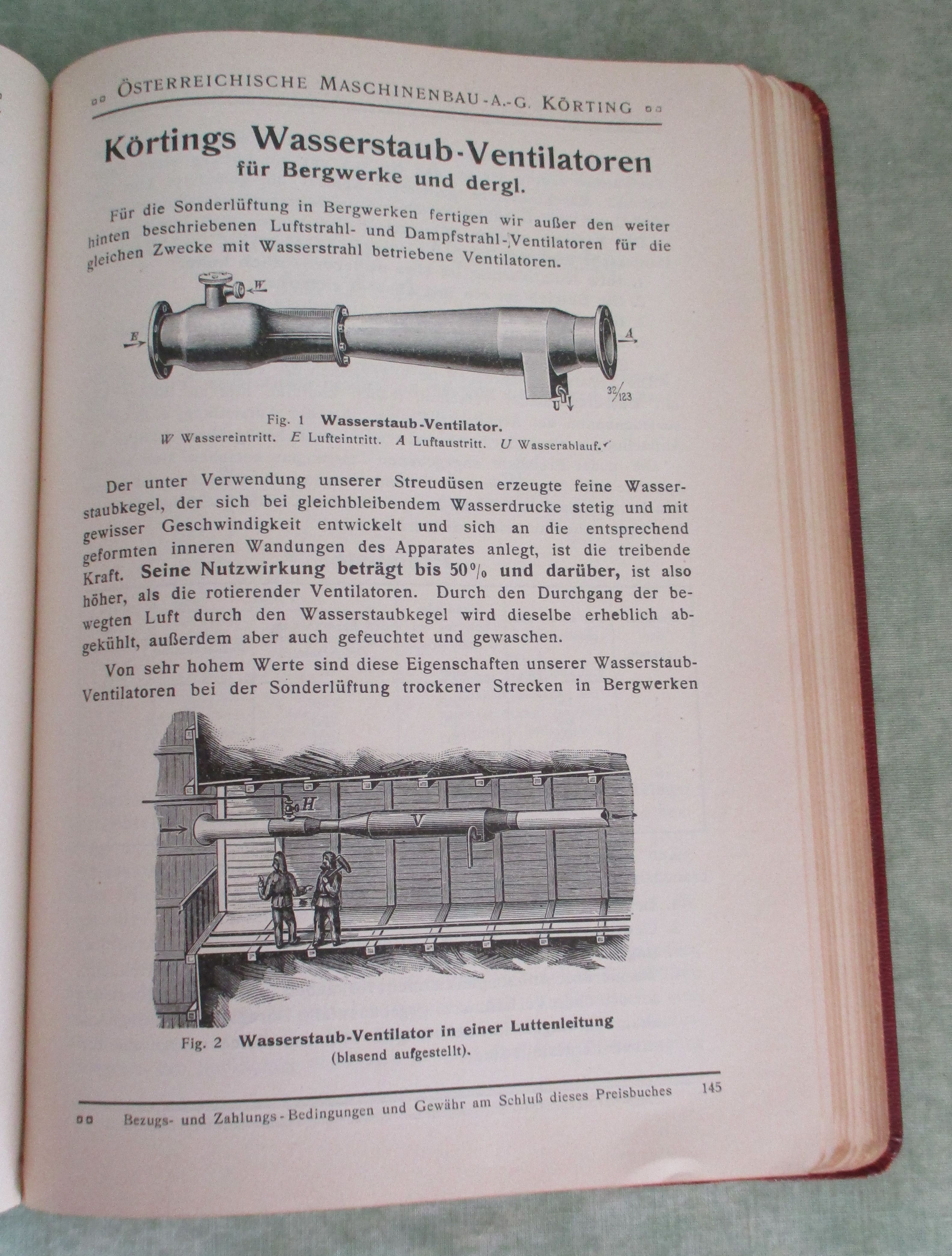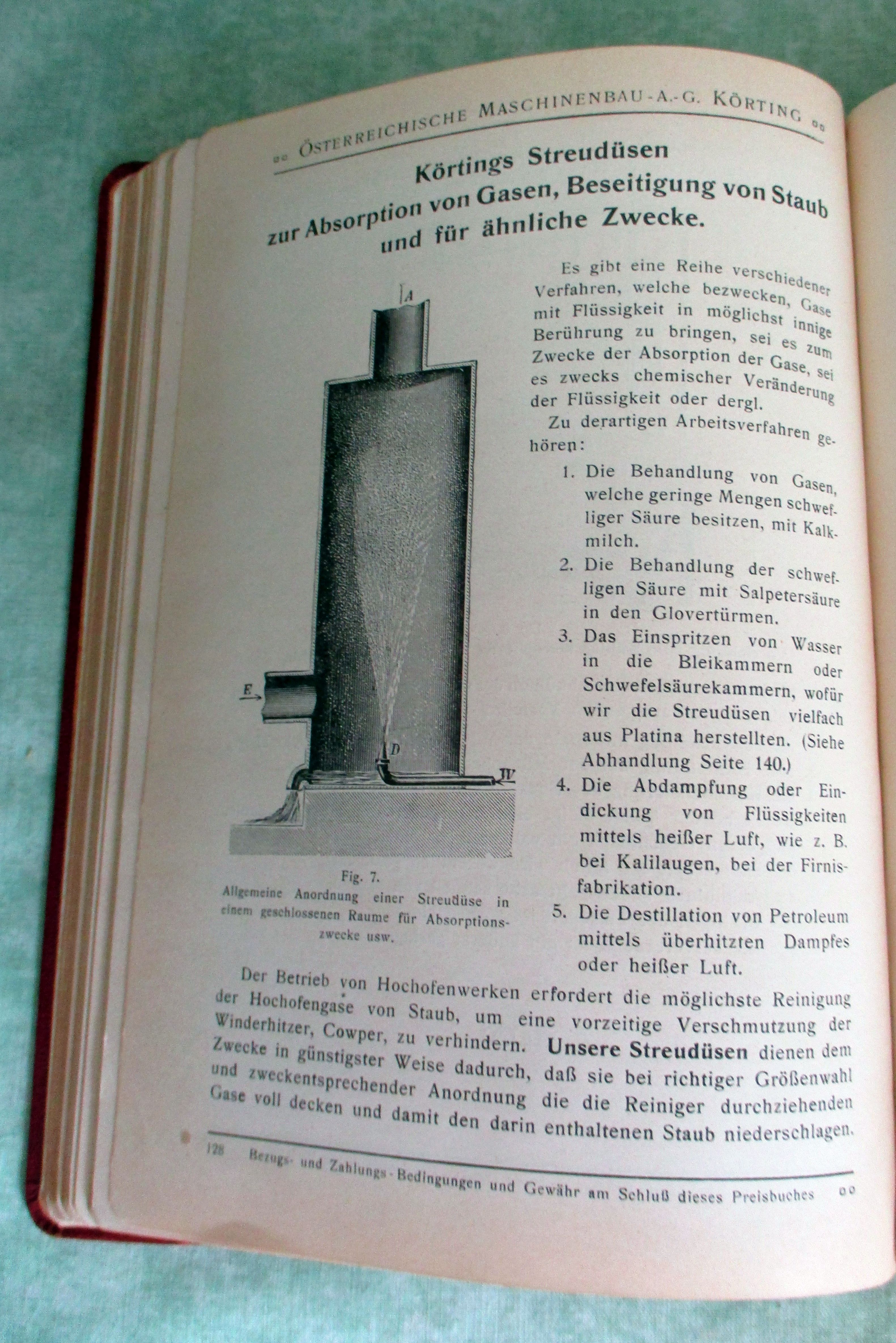Firmengeschichte + Firmenkataloge Österr. Maschinenbau A.G. Körting. Wien XX – Dresdnerstr. 68-70. Preis-Buch sämtlicher Erzeugnisse der Abteilung Strahlapparate mit kurzer Aufzählung der Fabrikate unserer Abteilungen: Heizung, Verbrennungs-Kraftmaschinen, Wasserwerke, Schiffs-. Automobil- und Luftschiffsmotoren. Wien. 1911/12. 14 x 20 cm. XVI. 296 Seiten, 12 Bl. (Abteilung für Heizung – Abteilung f. Verbrennungskraftmaschinen – Abteilung für Pumpen- und Wasserwerke – Abteilung für Boots, Automobil- und Luftschiffsmotoren.) Kunstleinen. Gutes Ex,