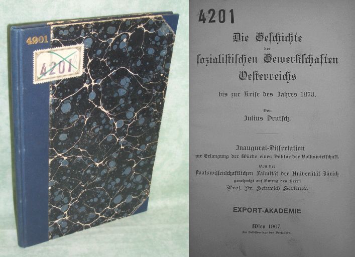 Österreich – Geschichte – Zeitgeschichte Deutsch, Julius: Die Geschichte der sozialistischen Gewerkschaften Österreichs bis zur Krise des Jahres 1873. Wien. Im Selbstverlag des Verfassers. 1907. 80 Seiten. Halbleinen. Exbibliotheksex. in gutem Zustand. Die Dissertation von Julius Deutsch.