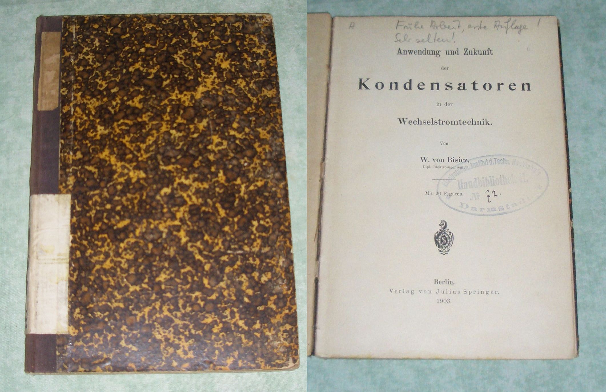 Elektrotechnik Bisicz, W. v.: Anwendung und Zukunft der Kondensatoren in der Wechselstromtechnik. Berlin, J. Springer, 1903. VI, 88 Seiten, 26 Textabb. Halbleinen der Zeit. Bibliotheksex., Stempel am Titel. Innen sauber und anstreichungsfrei.