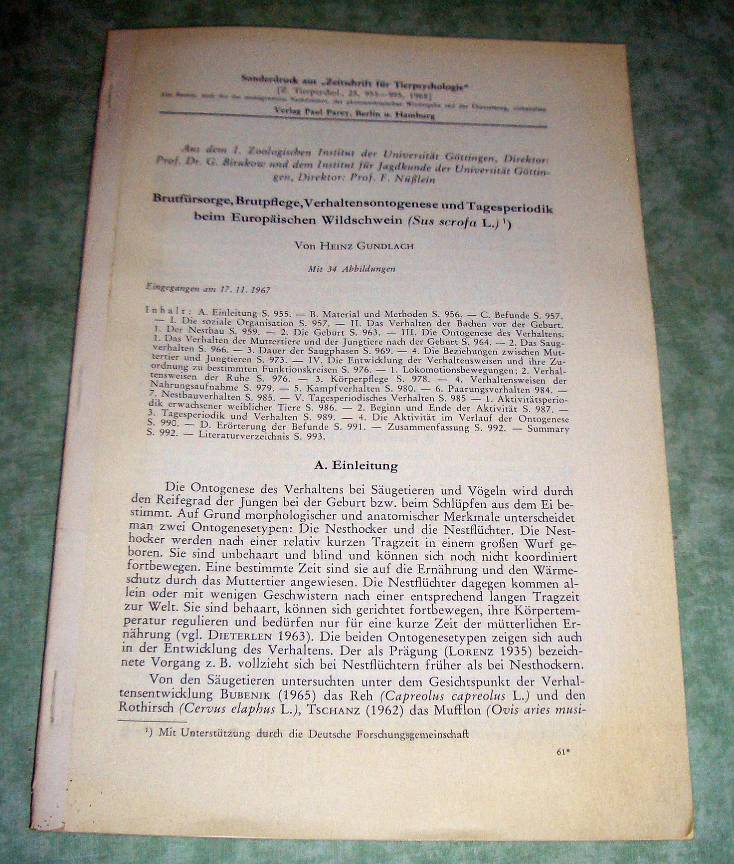 Zoologie Gundlach, Heinz. Brutfürsorge, Brutpflege, Verhaltensontogenese und Tagesperodik beim Europäischen Wildschwein (Sus scrofa L.). Parey. 1968. S. 955 – 995. Sdr.: Ztschr. f. Tierpsychologie 25.