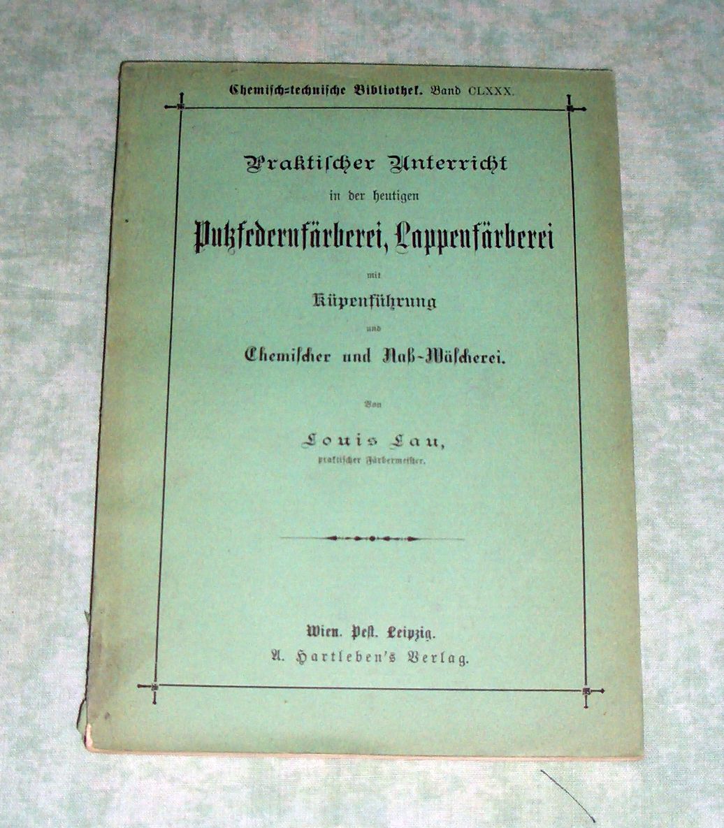Chemische Technologie Lau, L. Praktischer Unterricht in der heutigen Putzfedernfärberei, Lappenfärberei mit Küpenführung und Chemischer und Naß-Wäscherei. Wien. Pest. Leipzig. Hartleben. 1890. 13x18. 160 Seiten, Originalbrosch. Kleiner Buchhandelsstempel am Titel. Chemisch-technische Bibliothek. Band CLXXX.