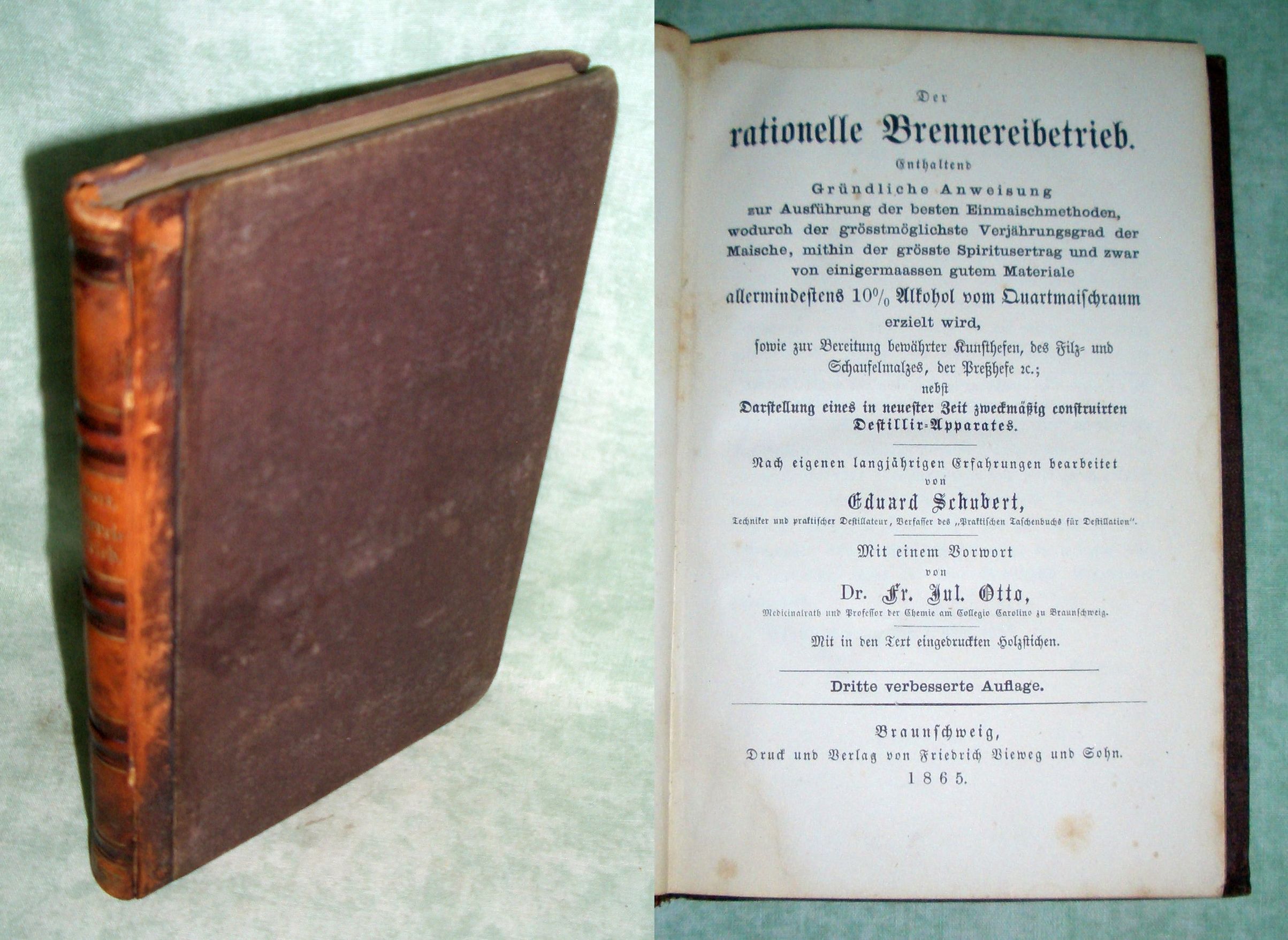 Chemische Technologie Schubert, Eduard: Der rationelle Brennereibetrieb. enthaltend Gründliche Anweisung der besten Einmaischmethoden, wodurch der grösstmöglichste Vergährungsgrad der Maische, mithin der grösste Spiritusertrag und zwar von einigermassen gutem Materiale allermindestens 10% Alkohol vom Quartmaischraum erzielt wird, sowie zur Bereitung bewährter Kunsthefen, des Filz- und Schaufelmalzes, der Preßhefe etc.; nebst Darstellung eines in neuester Zeit zweckmäig construirten Destillir-Apparates. 3., verb. Aufl. Braunschweig. Vieweg. 1865. XV. 226 Seiten, 32 Holzstichabb. Halbleder. Lederrücken berieben, vereinzelt kleine Flecken. Insgesamt ein gutes Ex,