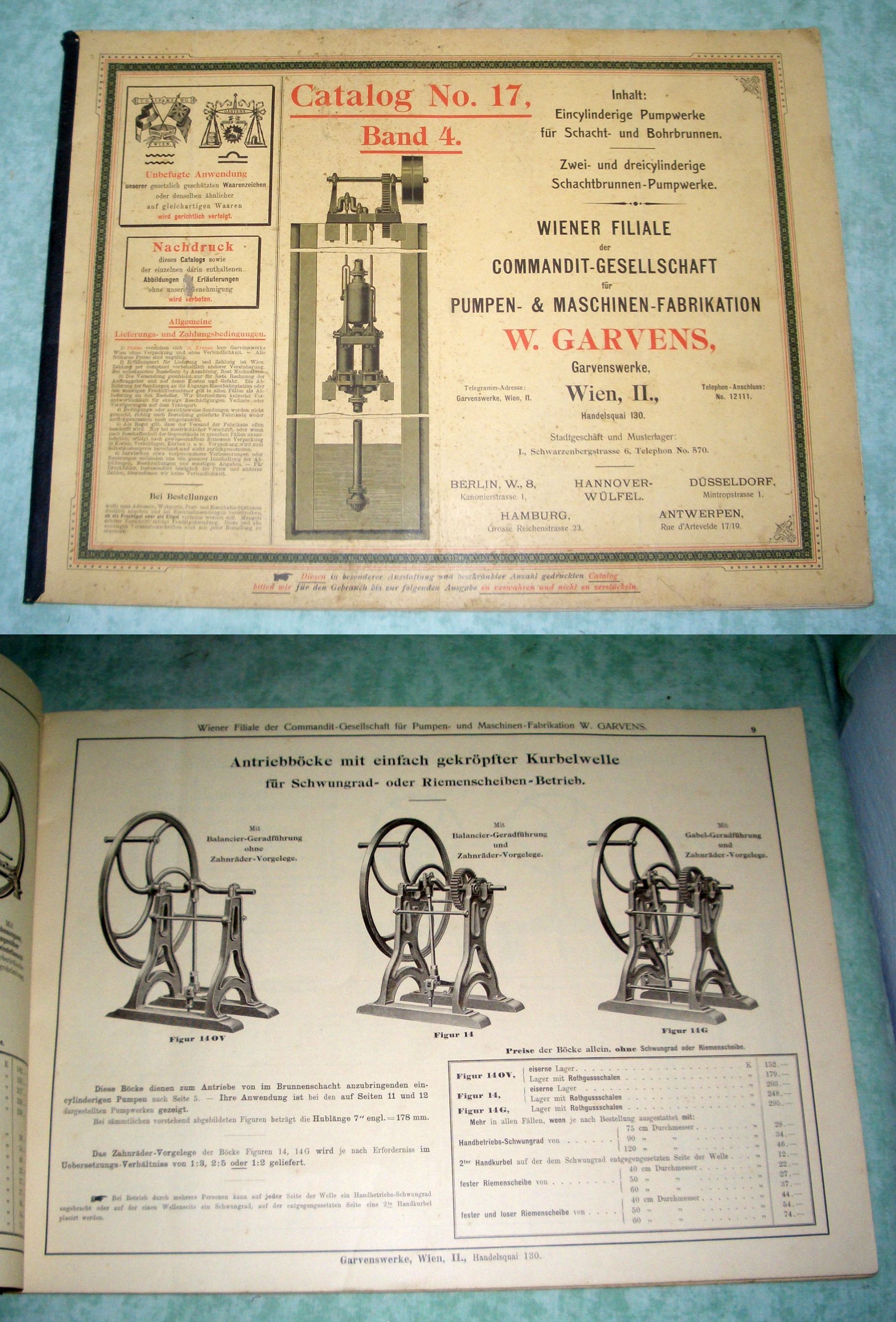 Firmengeschichte + Firmenkataloge W. Garvens. Commandit-Gesellschaft für Pumpen und Maschinen-Fabrikation. Wiener Filiale. Catalog No. 17. Band 4. Eincylindrige Pumpwerke für Schacht- und Bohrbrunnen. Zwei- und dreiclindrige Schachtbrunnen-Pumpwerke. Um 1900. 38,3 cm x 28,5 cm, 52 Seiten, durchgehend illustriert.