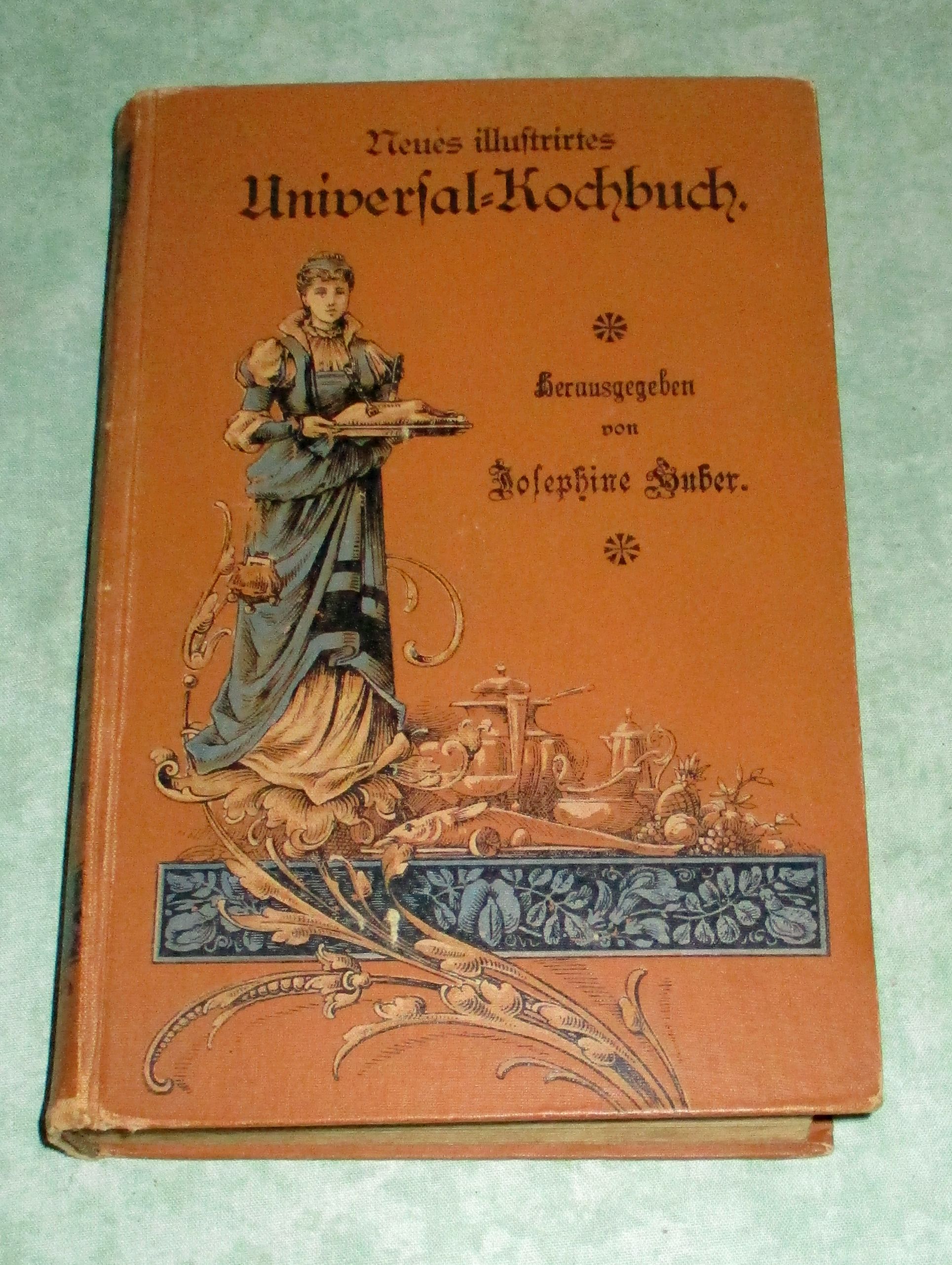 Koch- + Haushaltungsbücher Huber, Josephine Neues illustrirtes Universal-Kochbuch für bürgerliche wie herrschaftliche Haushaltungen, mit besonderer Berücksichtigung der altbayerischen und österreichischen Küche. 1911 Original-Recepte. Regensburg, J. Habbel, 1899. 2 Bl., 726 Seiten. Illustr. Originalleinen. Einband gerinfügig bestossen, Vorsatz und Titelseite leicht stockfleckig, insgesamt ein gutes sammelwürdiges Ex.