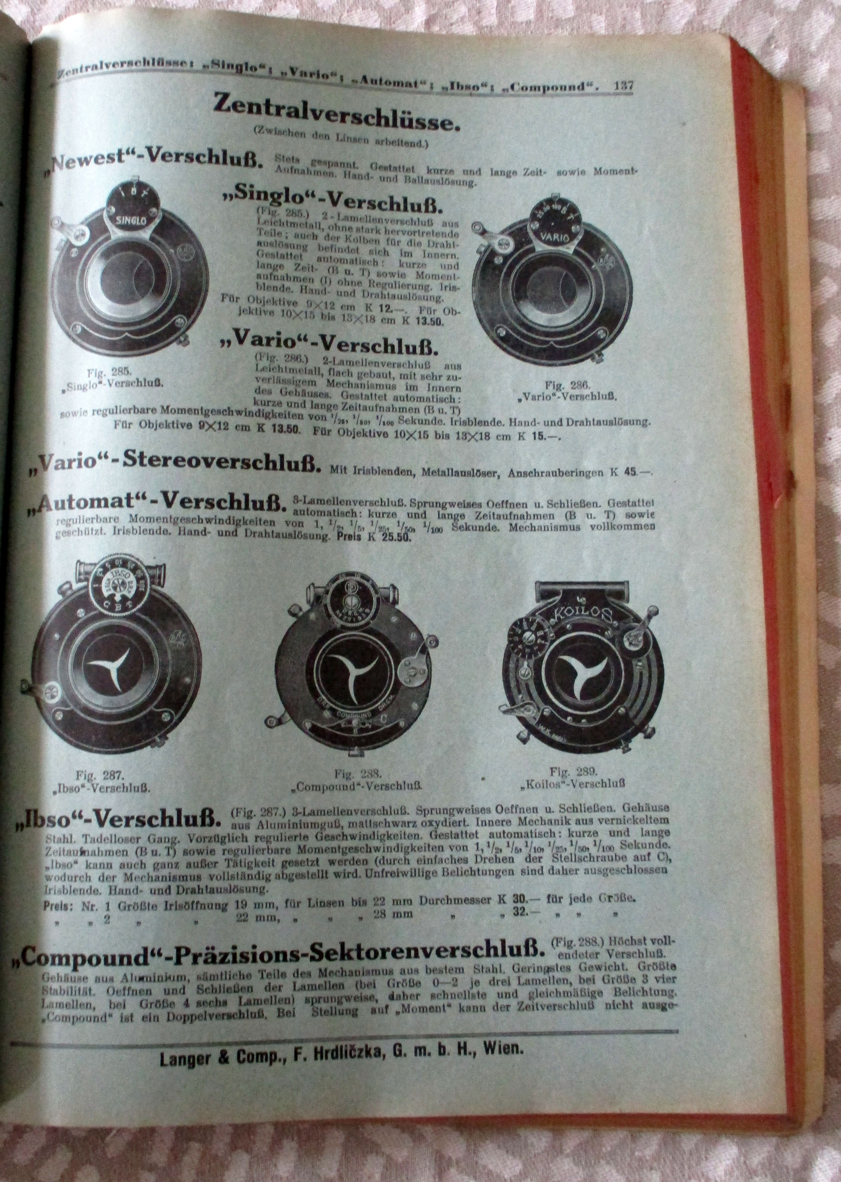 Firmengeschichte + Firmenkataloge Vereinigte Photographische Industrien. Langer & Comp. F. Hrdliczka G.m.b.H. Preisliste photographischer Bedarfsartikel und Ratgeber für deren Auswahl und Benützung, Wien. 1915. 408 Seiten, durchgehend illustriert. Einband gebrauchsspurig, innen in sehr gutem Zustand. Aus dem Inhalt: Kameras aller Art (Klappkaneras, Auszugkameras, Stereokameras, Westentaschenkameras, Spreizenkameras, Spiegelreflexkameras, Ballonkameras, Stativapparate usw.) der Marken Contessa, Ernemann, Rietzschel, Voigtländer, Goerz, Kodak, Ica, Linhof, Sonnet, Goltz und Brautmann, Nettel usw., Filme und Platten, Dunkelkammerzubehör, Dioskope und Stereobetrachtungsapparate, Kino- und Projektionsapparate usw.