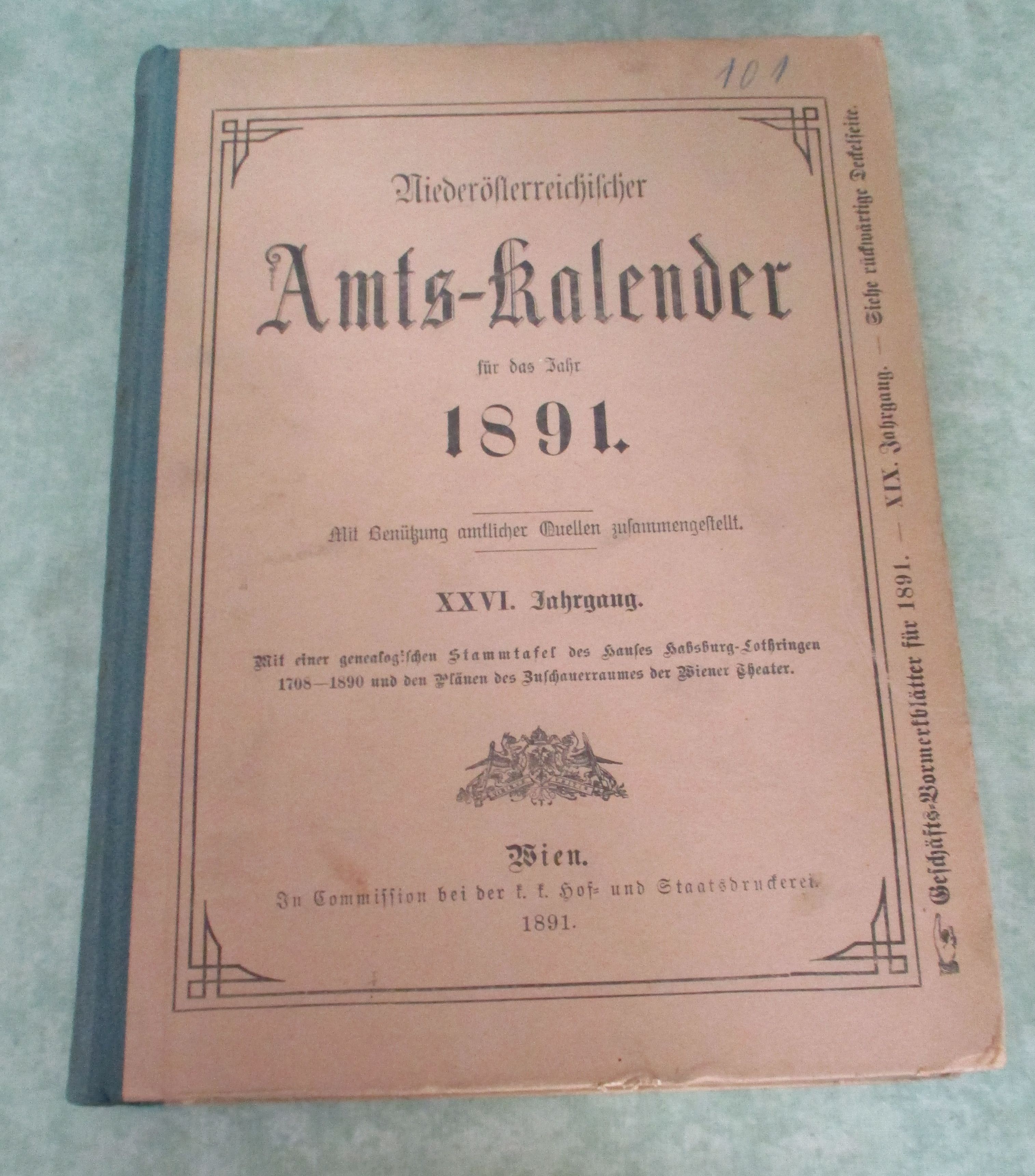 Niederösterreich – Orts- und Landeskunde Niederösterreichischer Amts-Kalender für das Jahr 1891. XXVI. Jahrgang. Mit Benützung amtlicher Quellen zusammengestellt. Mit einer genealogischen Stammtafel des Hauses Habsburg-Lothringen 1708-1890 und den Plänen des Zuschauerraumes der Wiener Theater. Wien. In Commission bei der k.k. Hof- und Staatsdruckerei. 1891.. 890 Seiten. Halbleinen. Kanten und Ecken leicht bestossen, ansonsten in sehr gutem Zustand. Inhalt: I. Theil: Hof. und allgemeiner Staatsschematismus. II. Theil: Niederösterreichischer Amtsschematismus. III.Theil: Geschäftsnotizen. Anhang: Alphabetisches Verzeichnis sämtlicher Ortschaften in Niederösterreich. Da bis 1920 Wien und Niederösterreich eine Einheit waren, beinhaltet der Amtskalender auch alle Angaben zu Wien, wie Behörden, Sanitätspersonen, Kirchliche Behörden und Anstalten, Vereine, Gebühren, Theater, Zeitschriften usw.