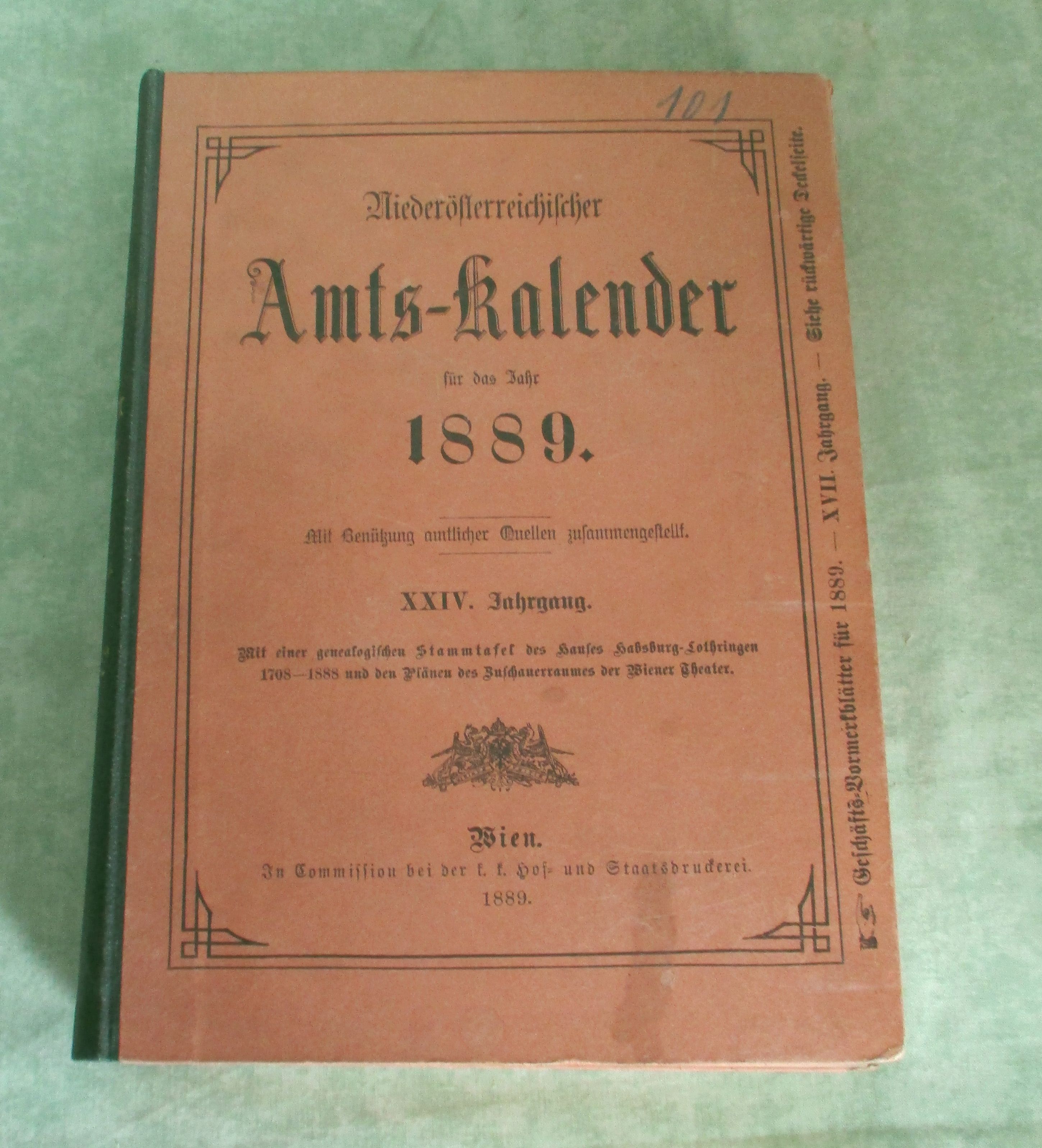 Niederösterreich – Orts- und Landeskunde Niederösterreichischer Amts-Kalender für das Jahr 1889. XXIV. Jahrgang. Mit Benützung amtlicher Quellen zusammengestellt. Mit einer genealogischen Stammtafel des Hauses Habsburg-Lothringen 1708-1888 und den Plänen des Zuschauerraumes der Wiener Theater. Wien. In Commission bei der k.k. Hof- und Staatsdruckerei. 1889. 816 Seiten. Halbleinen. Ecken bestossen, insgesamt ein gutes Ex. Inhalt: I. Theil: Hof. und allgemeiner Staatsschematismus. II. Theil: Niederösterreichischer Amtsschematismus. III.Theil: Geschäftsnotizen. Anhang: Alphabetisches Verzeichnis sämtlicher Ortschaften in Niederösterreich. Da bis 1920 Wien und Niederösterreich eine Einheit waren, beinhaltet der Amtskalender auch alle Angaben zu Wien, wie Behörden, Sanitätspersonen, Kirchliche Behörden und Anstalten, Vereine, Gebühren, Theater, Zeitschriften usw.