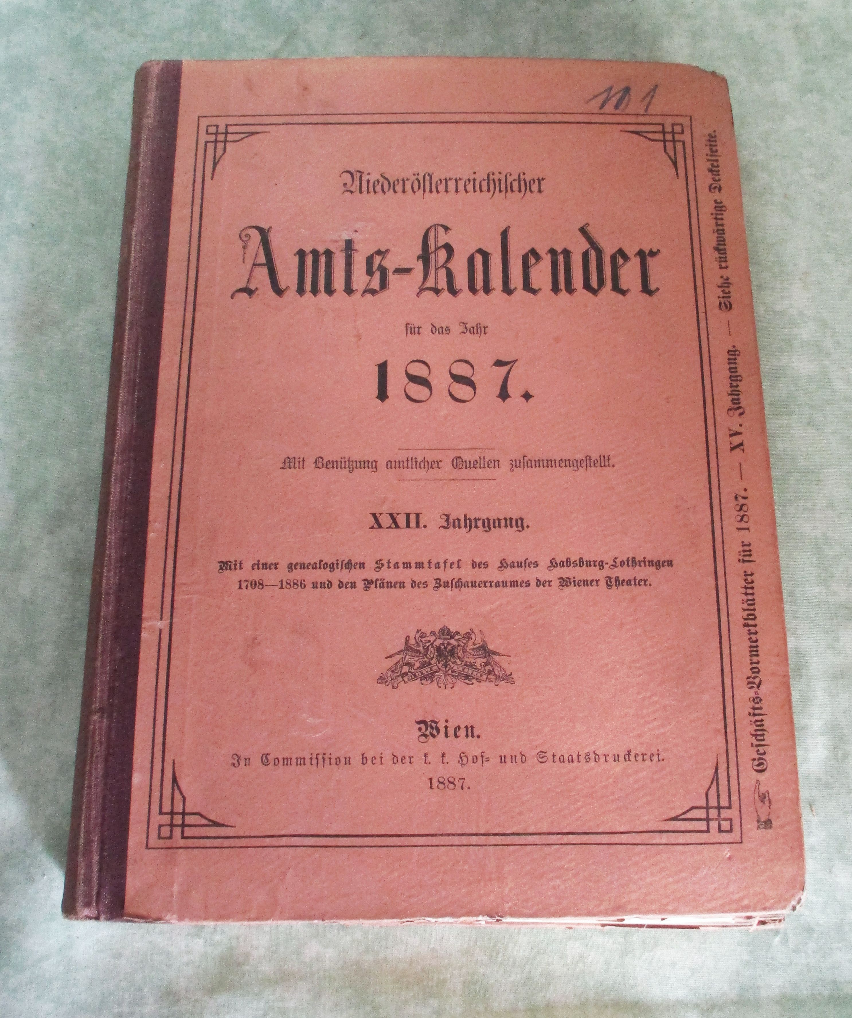 Niederösterreich – Orts- und Landeskunde Niederösterreichischer Amts-Kalender für das Jahr 1887. XXII. Jahrgang. Mit Benützung amtlicher Quellen zusammengestellt. Mit einer genealogischen Stammtafel des Hauses Habsburg-Lothringen 1708-1886 und den Plänen des Zuschauerraumes der Wiener Theater. Wien. In Commission bei der k.k. Hof- und Staatsdruckerei. 1887. 848 Seiten. Halbleinen. Ecken bestossen, insgesamt ein gutes Ex. Inhalt: I. Theil: Hof. und allgemeiner Staatsschematismus. II. Theil: Niederösterreichischer Amtsschematismus. III.Theil: Geschäftsnotizen. Anhang: Alphabetisches Verzeichnis sämtlicher Ortschaften in Niederösterreich. Da bis 1920 Wien und Niederösterreich eine Einheit waren, beinhaltet der Amtskalender auch alle Angaben zu Wien, wie Behörden, Sanitätspersonen, Kirchliche Behörden und Anstalten, Vereine, Gebühren, Theater, Zeitschriften usw.
