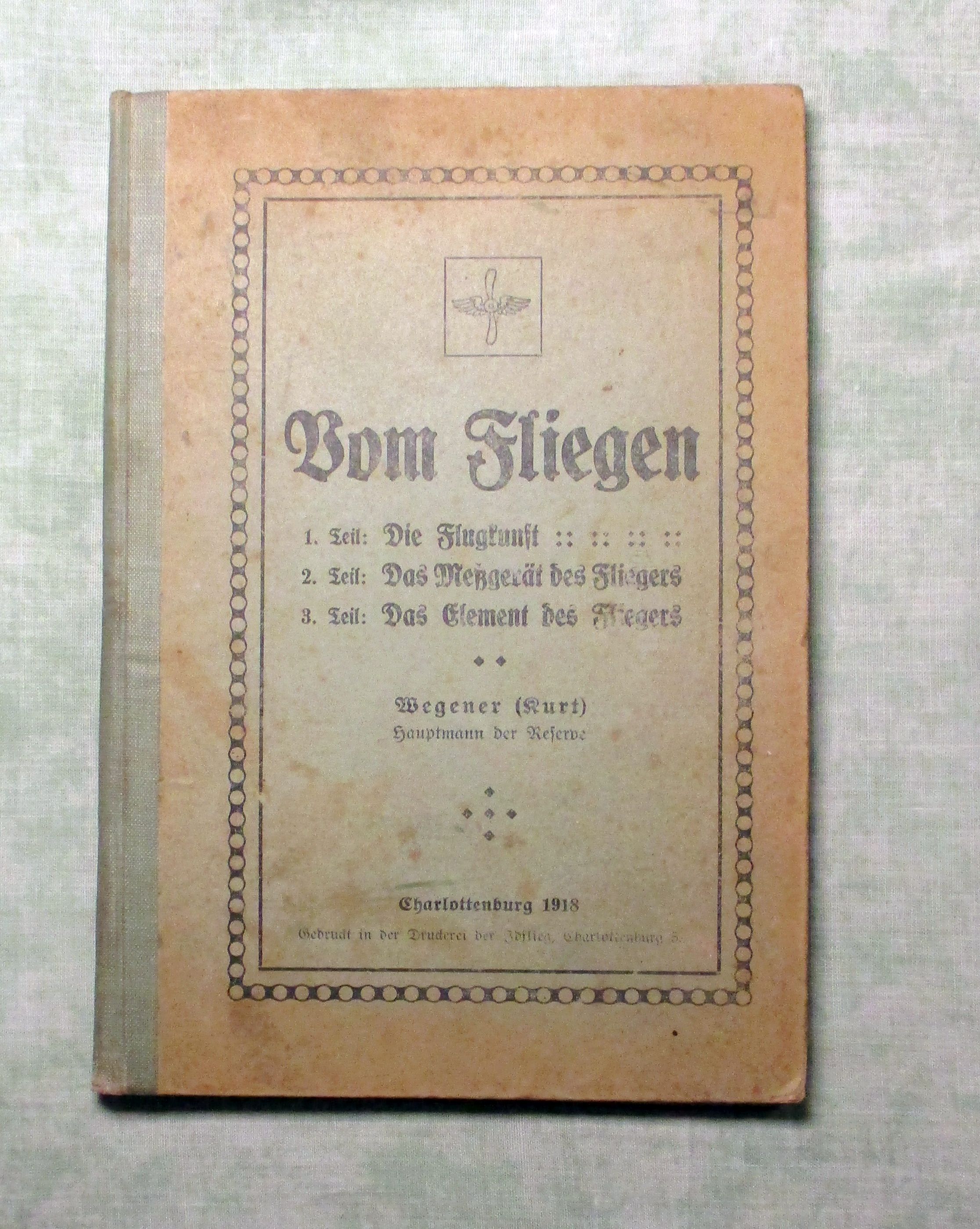 Luft- + Raumfahrt Wegener, Kurt: Vom Fliegen. Erstausgabe. München/Berlin. R. Oldenbourg. 1918. 8. 92 Seiten, zahlr. Textillustr. Halbleinen. Einband und Vorsatz fleckig. 1. Teil: Die Flugkunst. 2. Teil: Das Meßgerät des Fliegers. 3. Teil: Das Element des Fliegers. –
