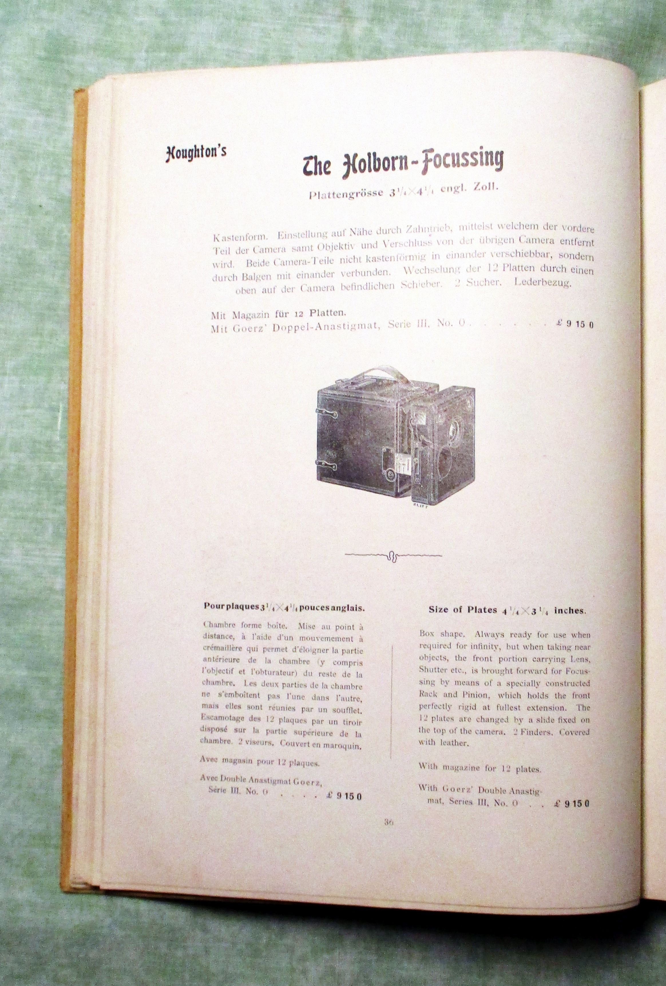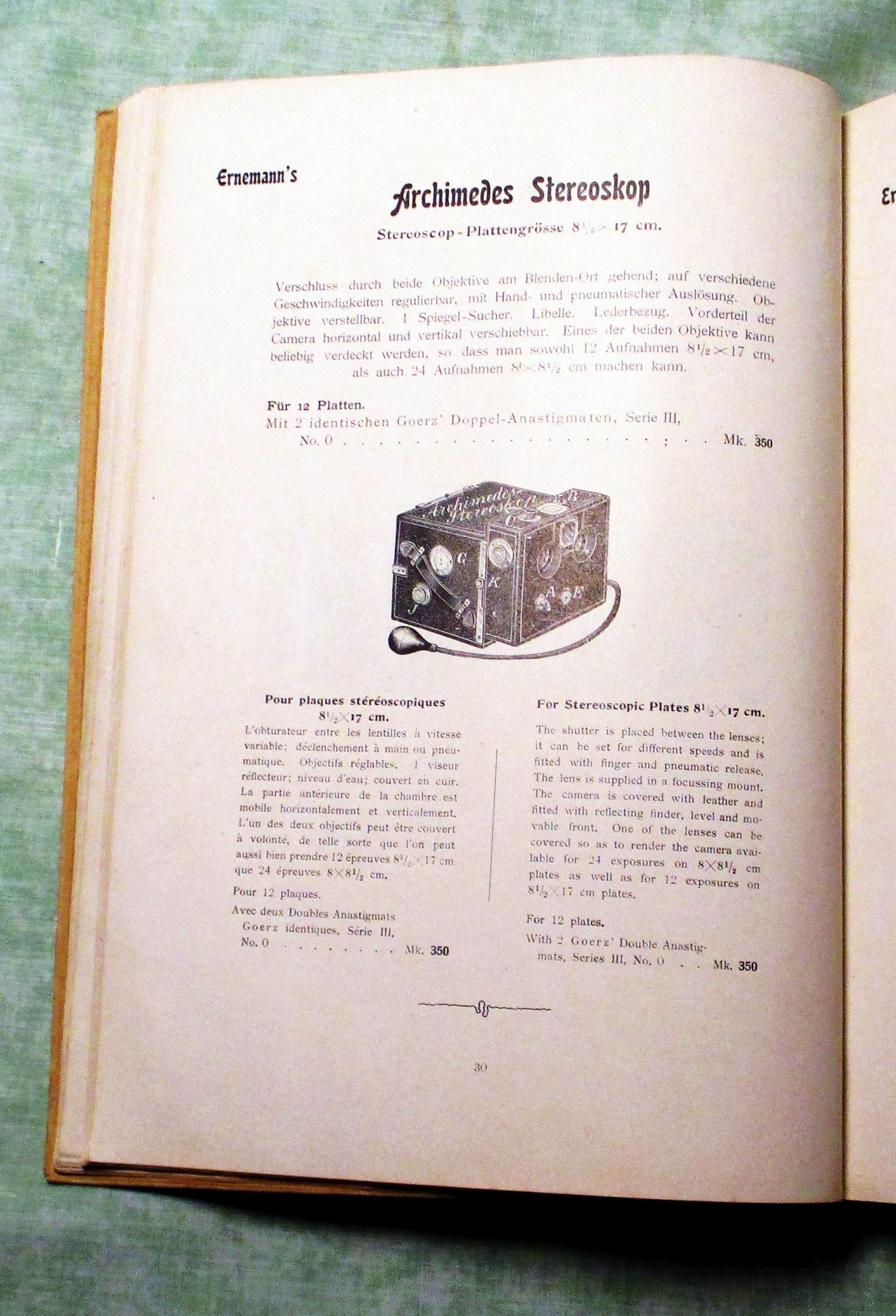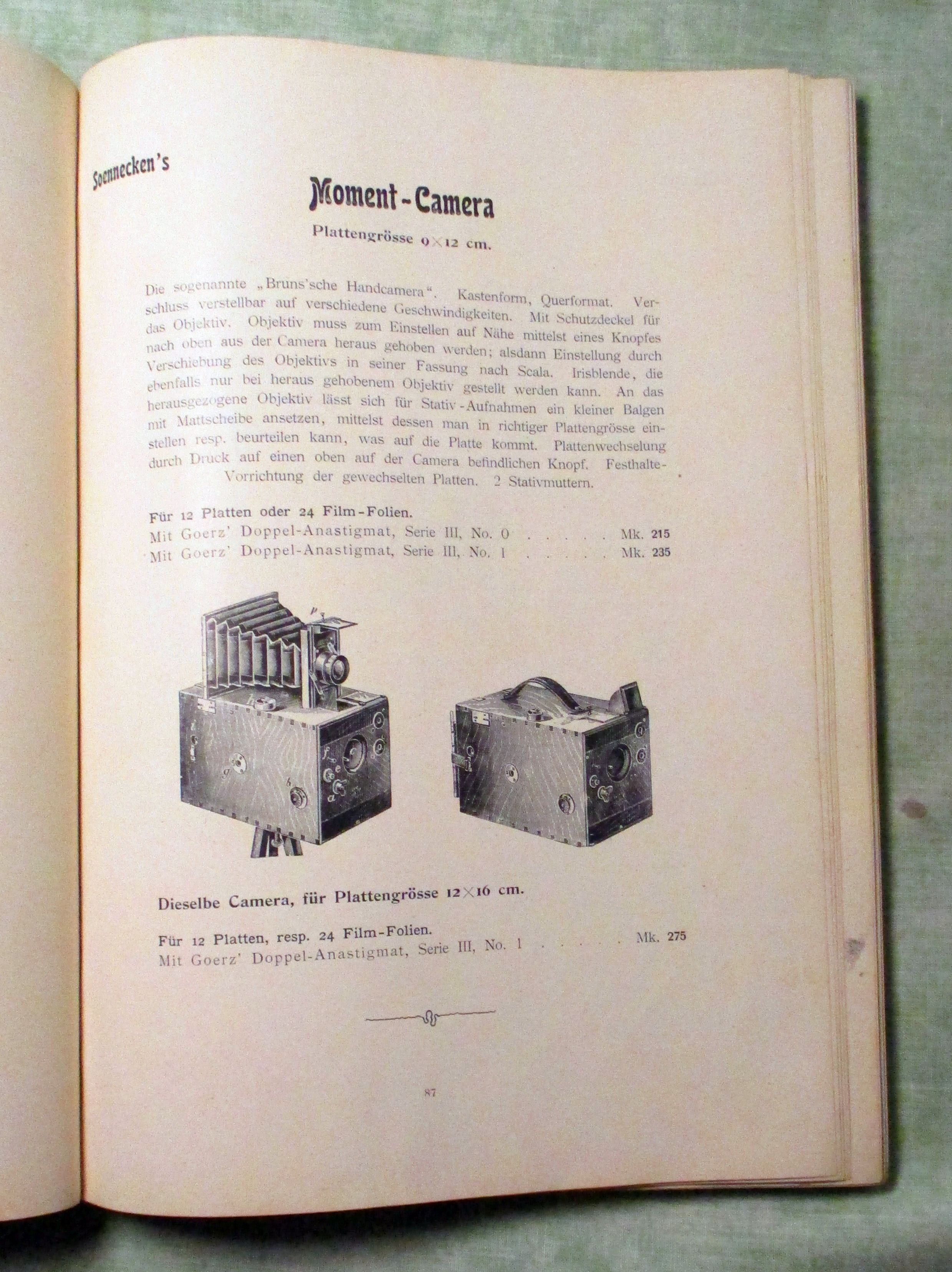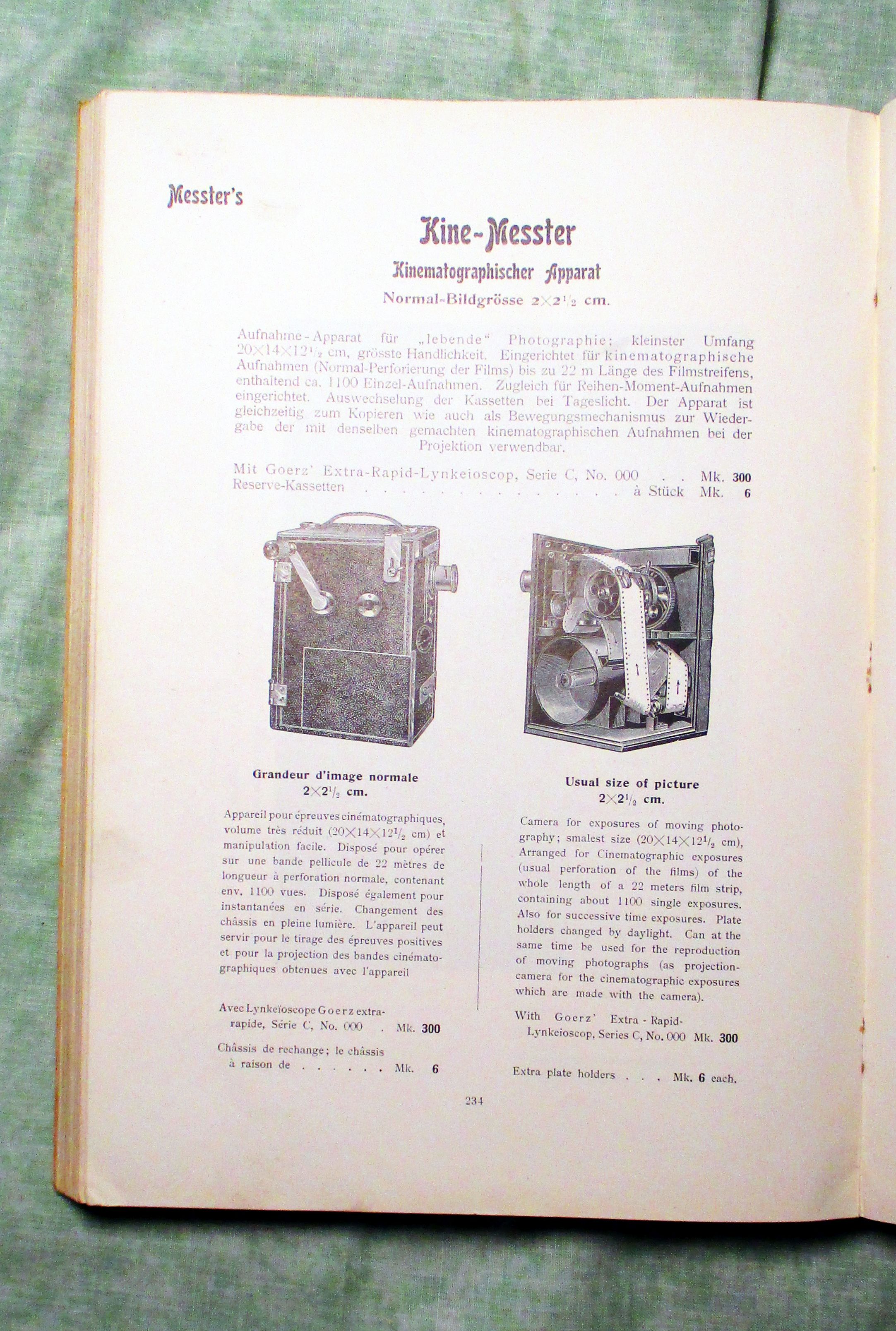Fotografie Optische Anstalt C.P. Goerz – Berlin Friedenau. Photographische Hand-Apparate ausgerüstet mit Goerz’ Doppelanastigmaten. Appareils photographique à main munis de Doubles Anastigmats Goerz – Photographic Hand Cameras fitted with Goerz’s Double Anastigmatic Lenses. um 1900.. 239 Seiten, durchgehend illustriert. Halbleinen. Einband leicht fleckig, innen sauber, insgesamt in gutem Zustand. Abteilung I: Magazin Cameras Abteilung II: Klapp-Cameras Abteilung III: Spiegel- (Reflex-) Cameras Abteilung IV: Film- Cameras für Tageslicht-Wechselung – Abteilung V: Cameras besonder Konstruktion.