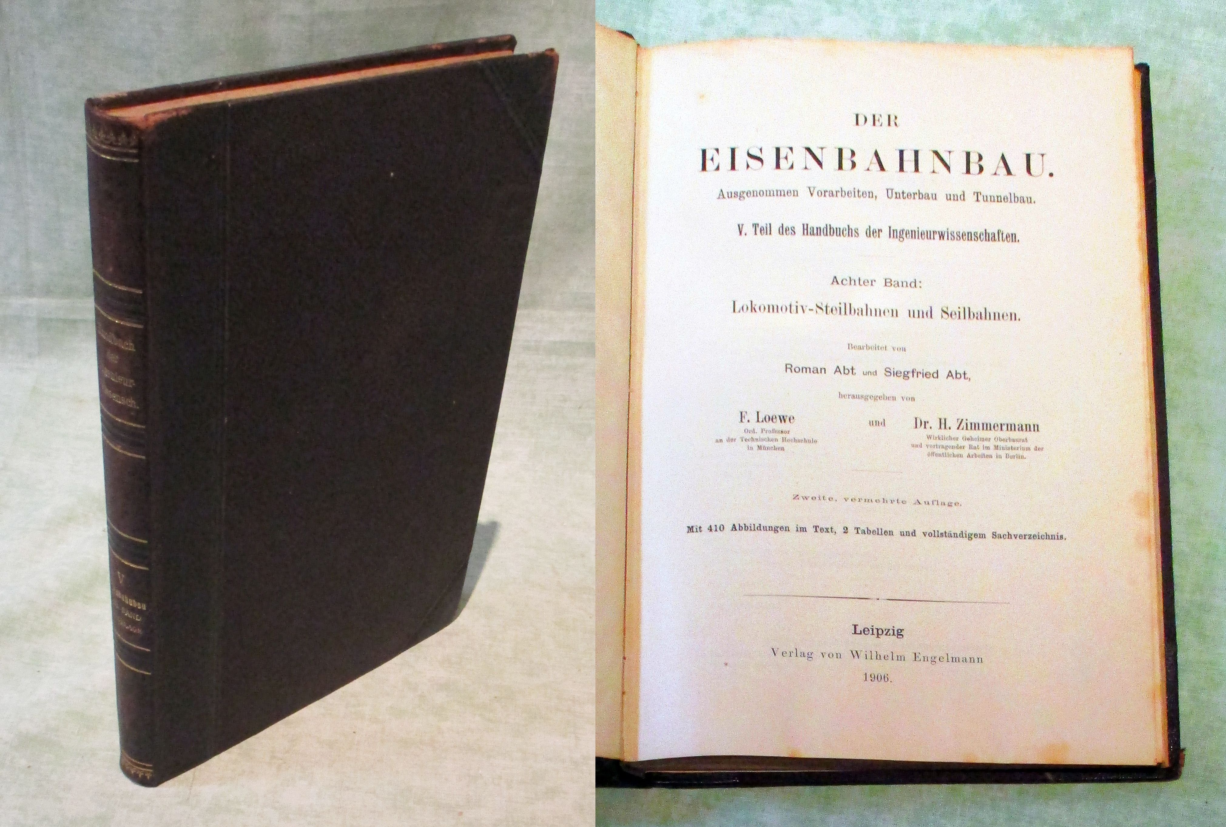 Eisenbahn Loewe, F. / Zimmermann, H. (Hrsg.) Der Eisenbahnbau. Lokomotiv-Steilbahnen und Seilbahnen. Bearbeitet von Roman und Siegfried Abt. Zweite, vermehrte Auflage. Leipzig. Engelmann. 1906. X. 300 Seiten, mit 410 Abb., 2 Tabellen und vollständigem Sachverzeichnis. Halbleder. In gutem Zustand. V. Teil des Handbuchs der Ingenieurwissenschaften. Der Eisenbahnbau. Achter Band.