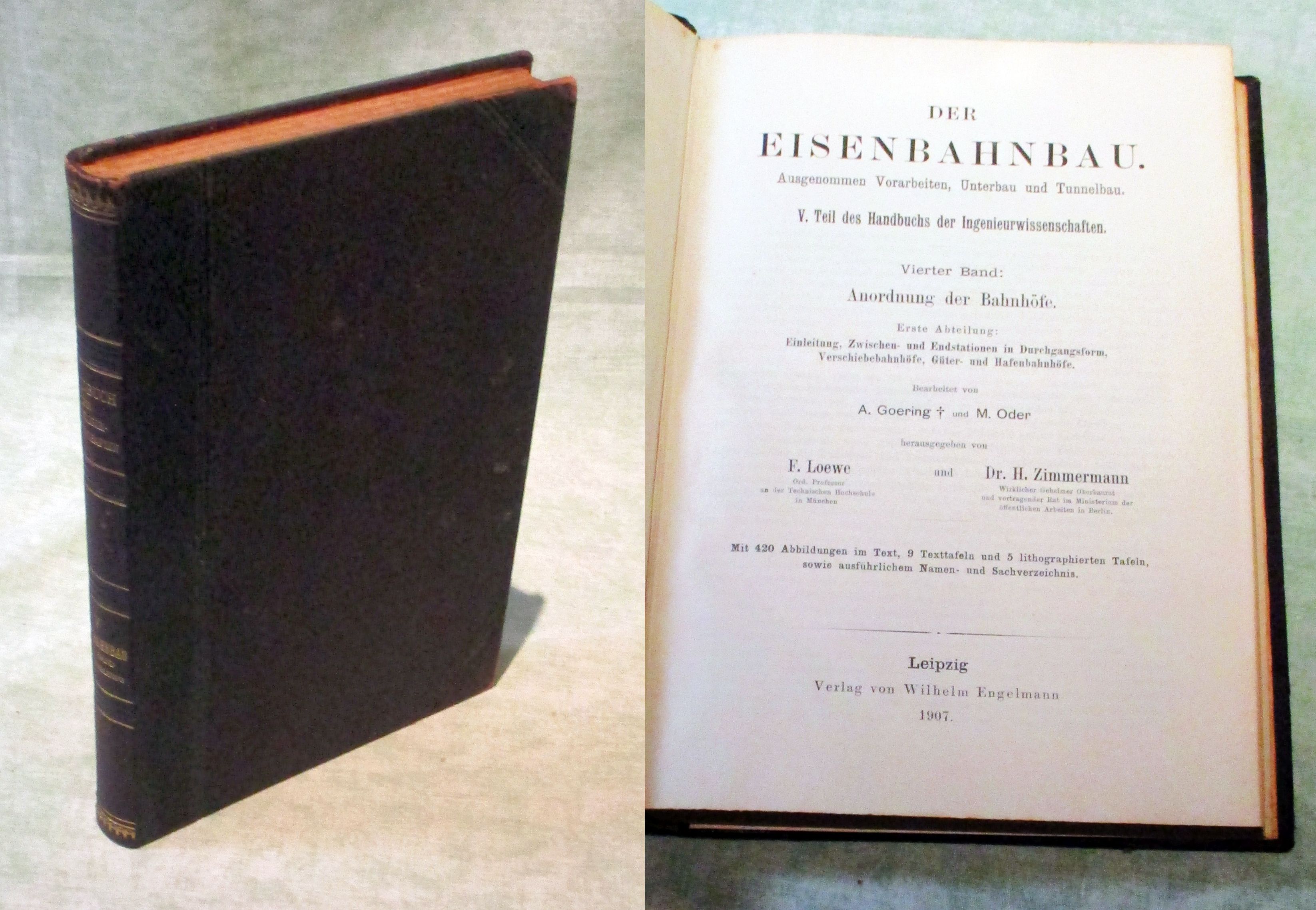 Eisenbahn Loewe, F. / Zimmermann, H. (Hrsg.) Der Eisenbahnbau. Anordnung der Bahnhöfe. Erste Abteilung: Einleitung, Zwischen- und Endstationen in Durchgangsform, Verschiebebahnhöfe, Güter- und Hafenbahnhöfe. Bearbeitet vonAlfred Birk. Zweite, vermehrte Auflage. Leipzig. Engelmann. 1907. XI. 336 Seiten, mit 420 Textabb., 9 Texttafeln und 5 lithographierten Tafeln, sowie ausführlichem Namen- und Sachverzeichnis. Halbleder. In gutem Zustand. V. Teil des Handbuchs der Ingenieurwissenschaften. Der Eisenbahnbau. Vierter Band.