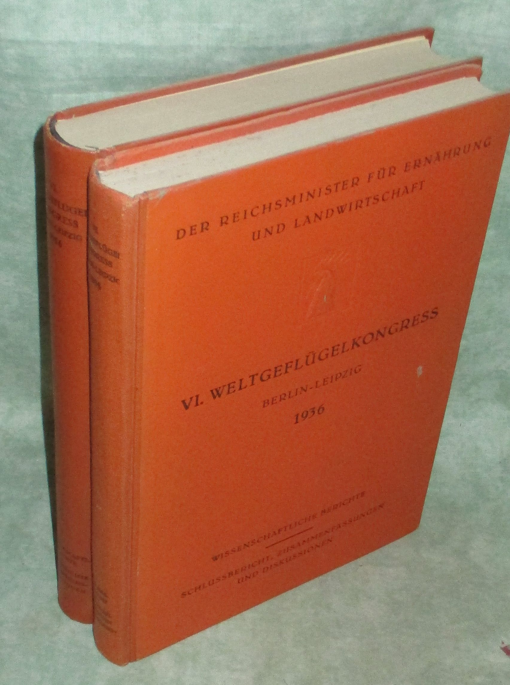Stubenvögel-, Geflügel-, und Taubenliteratur Wissenschaftliche Berichte des VI.Weltgeflügelkongresses 24. Juli bis 2. August 1936. Berlin und Leipzig. Band I und II Hauptberichte und Sektionsmitteilungen. Band III Schlussbericht, Zusammenfassungen und Diskussionen. Verlegt durch das Generalsekretariat des VI.Weltgeflügelkongresses Berlin-Leipzig. 3 in zwei Bänden. 367.276.530 Seiten. Kunstleinen. Die Bände beinhalten nicht nur Beiträge über Geflügel, sondern auch allgemeine Beiträge über Kleintierzucht und Kaninchenhaltung.