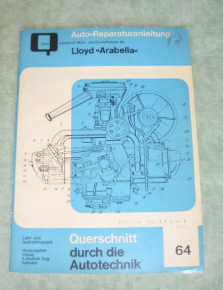 Auto + Motorrad Lloyd Arabella. Auto-Reparaturanleitung. Querschnitt mit Mass- und Einstelltabelle. Zug. A. Bucheli. 1964. -4°. 49 Seiten. Schwacher Stempel am Titel. Querschnitt durch die Autotechnik 64.