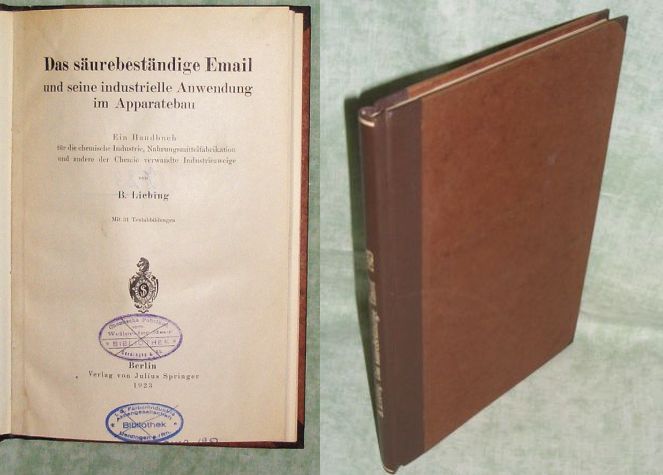 Chemische Technologie Liebing, Bernhard. Das säurebeständige Email und seine industrielle Anwendung im Apparatebau. Ein Handbuch f. d. chemische Industrie, Nahrungsmittelfabrikation u. a. der Chemie verwandte Industriezweige. Berlin, Julius Springer, 1923. gr. 8. VI, 99 Seiten., 34 Textabb. Exbibliotheksex. aus der Kekulébibliothek der Farbenfabriken Leverkusen mit Exlibris und Stempeln. Gutes sauberes Ex.