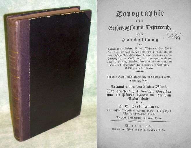 Wien – Landeskunde Stelzhammer, J.C. Das gewesene Stift von St. Dorothea und die Pfarre Roßau mit der vom Lichtenthale. Wien. 1836. VI. 396 Seiten, miit zwei Abb. und einer Karte. Halbleinen der Zeit mit goldgepr. Rücken. Kanten etwas bestossen, sehr vereinzelt Buntstiftanstreichungen im unbedruckten Randbereich. Stelzhammer, J.C. Topographie des Erzherzogthums Oesterreich. Der ersten Abtheilung zehnter Band, des ganzen Werkes fünfzehnter Band. Untertitel: Maximilian Fischer: Historische Darstellung des Stiftes der regulirten lateranensischen Chorherren St. Dorothea zu Wien bis zu dessen Vereinihgung mit dem Stifte Klosterneuburg. Mit 67 Urkunden. Geschichte des Klosters der Diener Mariä (Serviten) in der Roßau, sammt den Schicksalen dieser Vorstadt, und der übrigen Klöster dieses Ordens, im Lande Nieder-Österreich. 2 lith. Abb.: Kirche und Kloster der Serviten in der Roßau. Palais des Freyh. v. Puthon. 1 Plan: Grundriss von der Rossau.