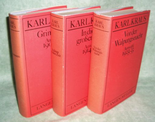 Literatur Kraus, Karl; Ausgewählte Werke .[Hrsg. von Dietrich Simon unter Mitarbeit von Kurt Krolop (Kommentierung) und Roland Links (Auswahl) auf Grund d. von Heinrich Fischer hrsg. Werke von Karl Kraus u.d. Zeitschrift Die Fackel]. Bd. 1 (1902-1914) Grimassen. Bd. 2 (1914-1925) In dieser großen Zeit. Bd. 3 (1925-1933) Vor der Walpurgisnacht. 3 Bände im Schuber. München, Langen/Müller, 566, 645, 690 Seiten. Leinen mit Schutzumschlag.