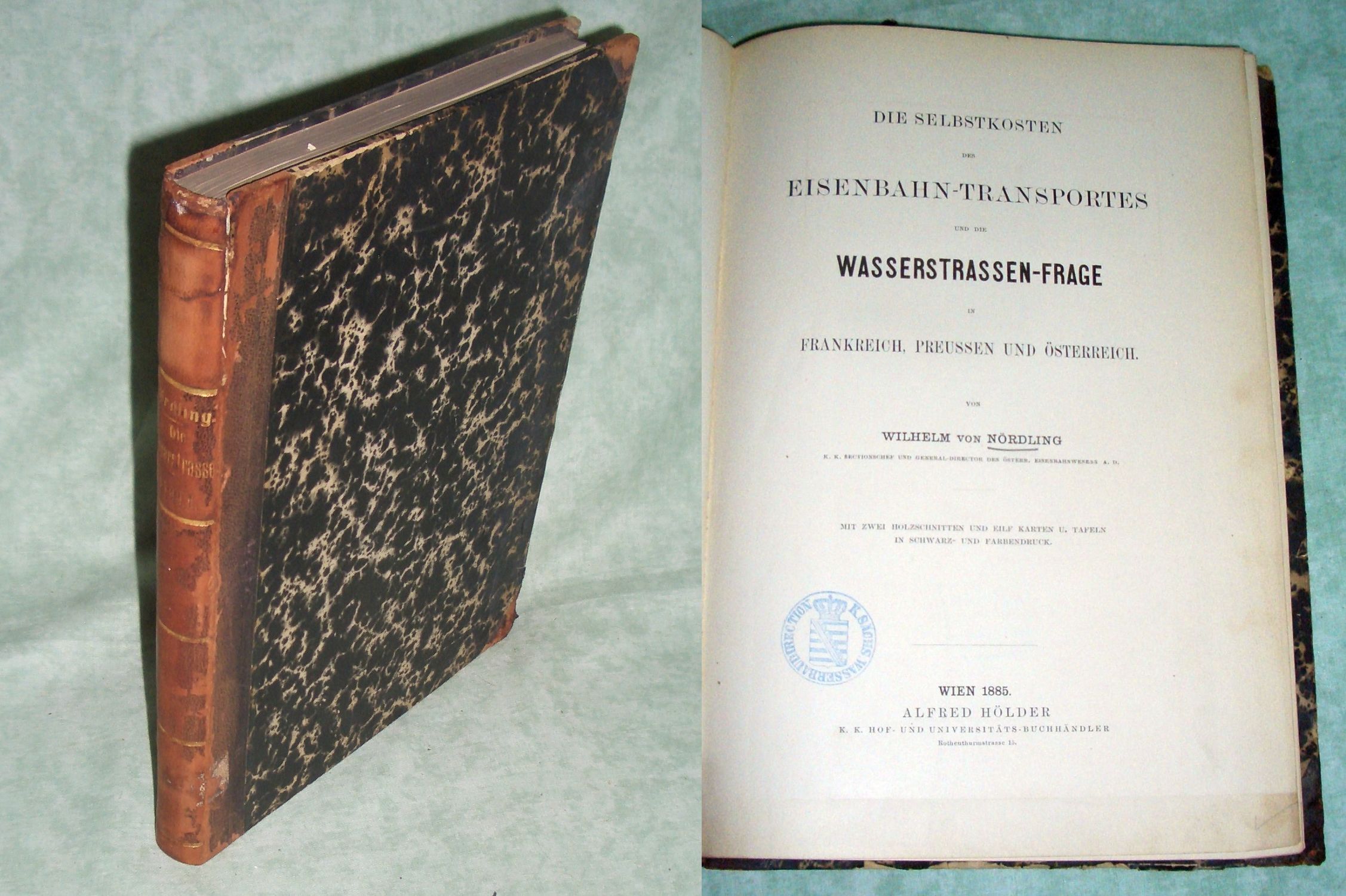 Eisenbahn Nördling, Wilhelm von: Die Selbstkosten des Eisenbahn-Transportes und die Wasserstrassen-Frage in Frankreich, Preussen und Österreich. Wien. Hölder. 1885. VIII, 232 Seiten, mit zwei Holzschnitten und elf Karten u. Tafeln. Halbleder. Einband berieben und bestossen, innen sauber und anstreichungsfrei.