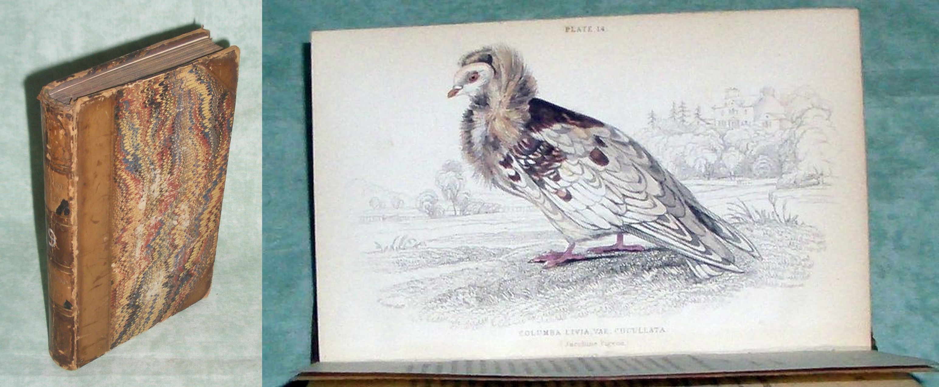 Ornithologie – Vogelkunde Jardine, William. The Naturalist’s Library. Vol. IX. Selby, John Prideaux. Pigeons. Edinburgh. W.H. Lizars. 1836.. 228 Seiten, mit 28 (von 30) handkolorierten Kupferstichen, einer farbigen Titelvignette und einem gestochenem Frontispiz. Halblederband der Zeit. Einband berieben, von Hand numerierter Rücken, innen etwas gebräunt und im Gelenk etwas gelockert. Sir William Jardine,(1800 – 1874)) war ein schottischer Ornithologe und Herausgeber zoologischer Werke. Jardine gab die in seiner Zeit bei allen Schichten der viktorianischen Gesellschaft populäre vierzigbändige Naturgeschichte The Naturalist’s Library heraus. Die 40 Bände beschreiben hauptsächlich die vier Gebiete: Ornithologie (14 Bände), Säugetiere (13 Bände), Entomologie (7 Bände) und Ichthyologie (6 Bände). Jedes Fachgebiet wurde von einem der führenden Spezialisten betreut. Das gesamte Werk wurde in Edinburgh von William Home Lizars verlegt. Prideaux John Selby (* 1788 – 1867) war ein englischer Ornithologe, Botaniker und Künstler. Selbys Name ist vor allem mit seinem Werk Illustrations of British Ornithology (1821–1834) verbunden; es war die erste Publikation, in dem die beschriebenen Vögel in Lebensgröße abgebildet waren. Viele seiner veröffentlichten Illustrationen zeigen Exemplare aus seiner umfangreichen Sammlung. Zusätzlich zu obigen Werken war er mit den Bänden über Tauben und Papageien an Jardines Naturalist’s Library beteiligt (1835, 1836),