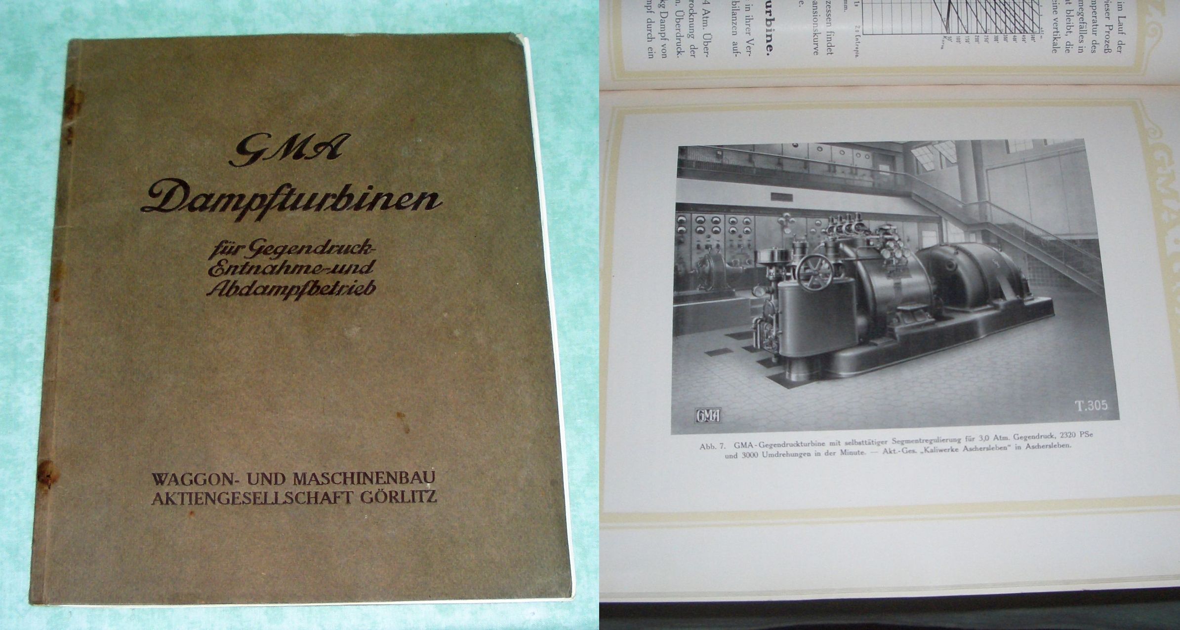 Firmengeschichte + Firmenkataloge Waggon- und Maschinenbau Aktiengesellschaft Görlitz. GMA-Dampfturbinen für Gegendruck-Entnahme und Abdampfbetrieb. Um 1920. 46 Seiten, 44 Abb. (Darunter 4 Abb. mit den verschiedenen Werken in Görlitz und Cottbus) kart.