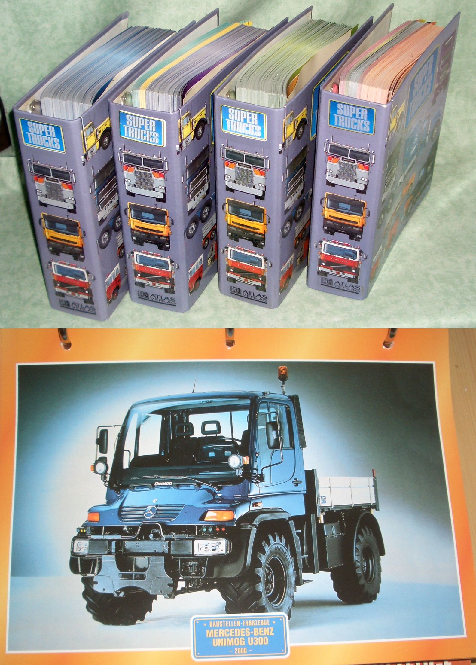Auto + Motorrad Super Trucks. Enzyklopädie der wichtigsten Typen und Modelle aus der Entwicklungsgeschichte des Lastkraftwagens. Eine Sammlung in zehn Kapiteln. München. Atlas Verlag. 1998. Über1000 Sammelkarten in 4 Klemmhebelmappen. Hauben-Zugmaschinen – Frontlenker-Zugmaschine – Mehrzweck-LKW – Baustellen-Fahrzeuge – Feuerwehr-Fahrzeuge – Schwerlastzüge – Militär-LKW – Renntrucks – Goldenes Zeitalter – Technologie.– Die Tafeln – im Format A4 – sind auf hochwertigem und stabilem Karton gedruckt Vorderseite mit einem Foto des Trucks, auf der Rückseite die technische Beschreibung mit Entwicklungs- und Produktionsgeschichte.