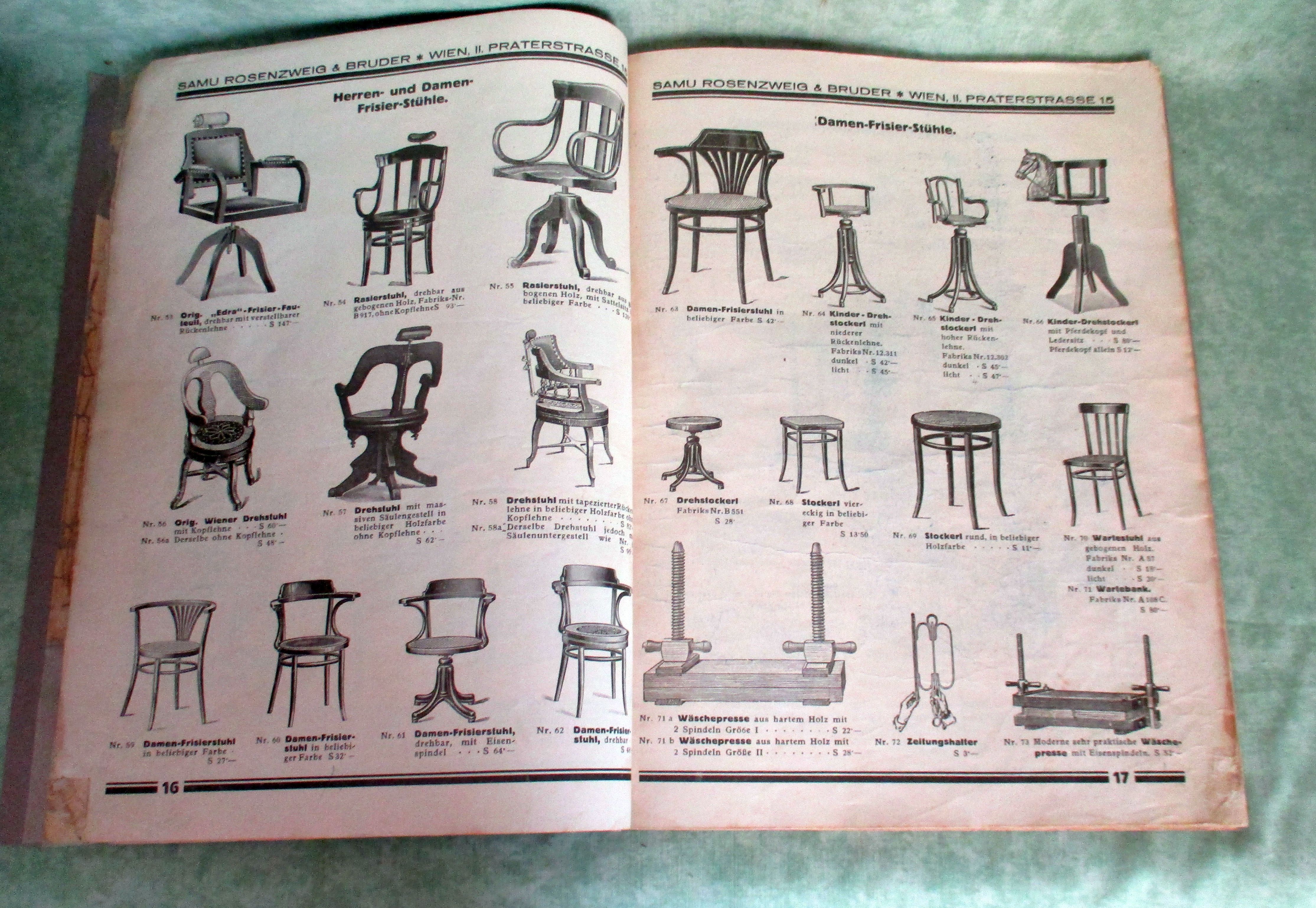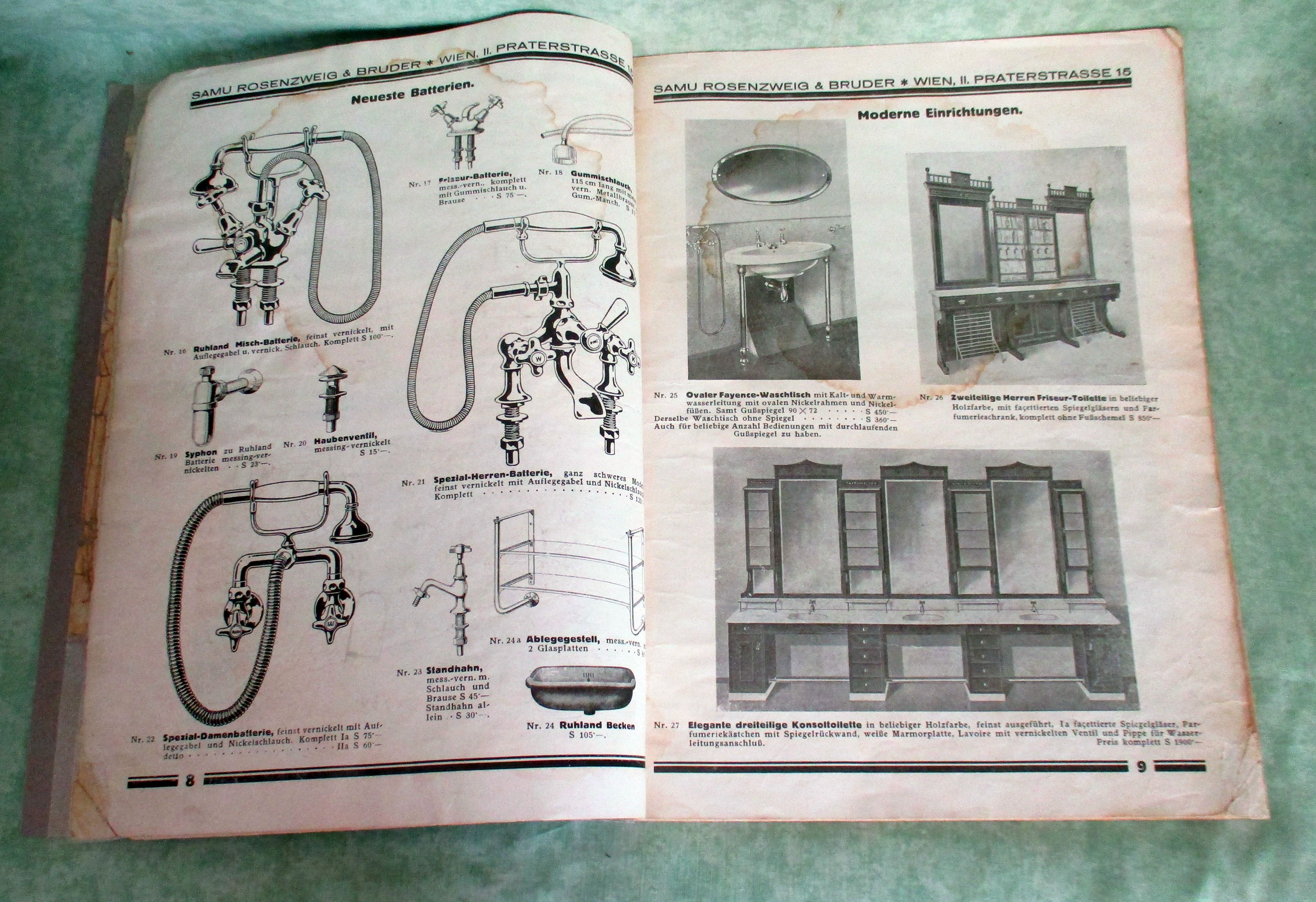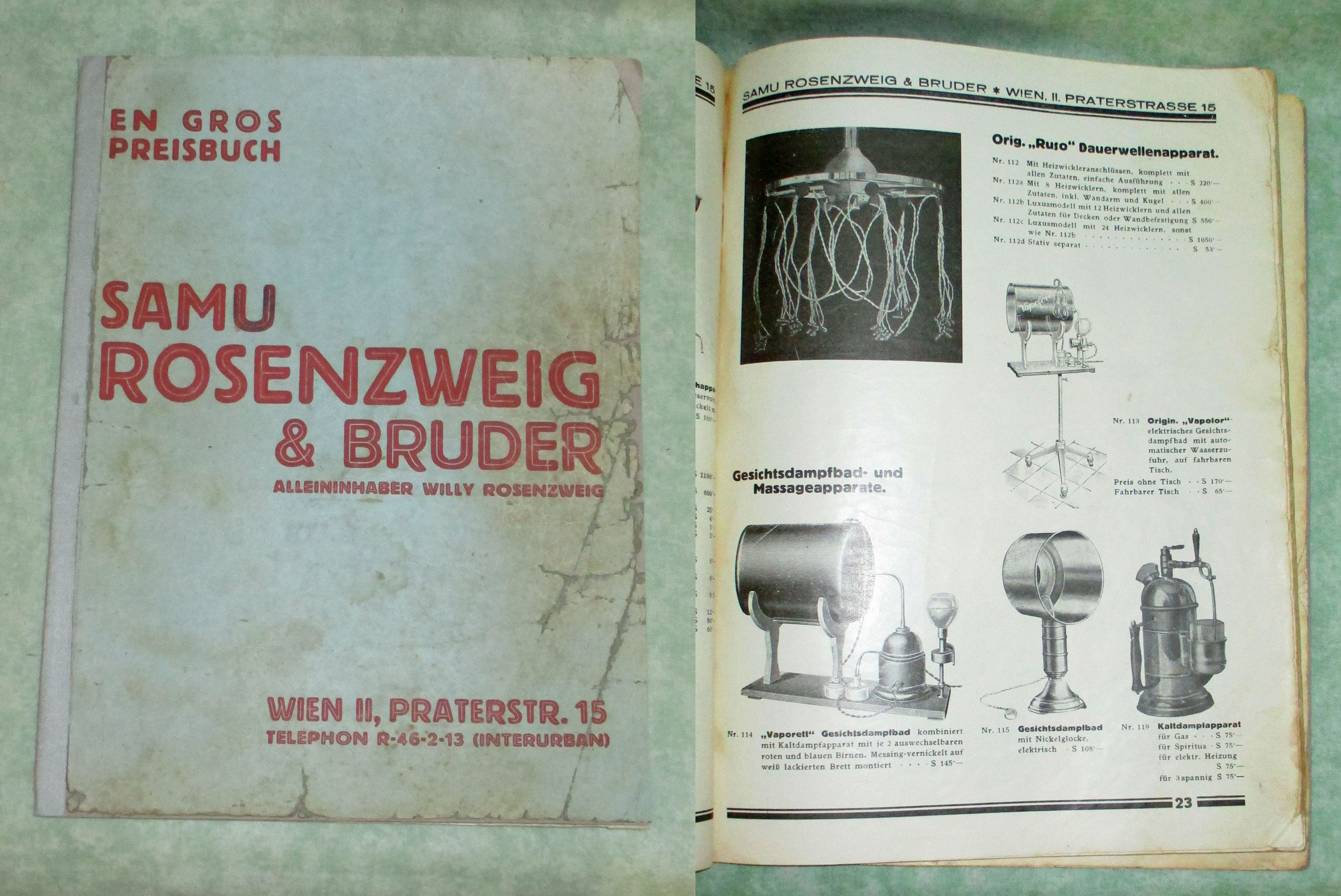 Firmengeschichte + Firmenkataloge Samu Rosenzweig & Bruder. Wien II. Bezirk, Praterstrasse Nr. 15 (Lloydhof). Grösstes Etablissment für moderne Herren- und Damen- Frisiersalon Einrichtungen. Illustrierte en gros Preisliste 1930. 64 Seiten. Einband knittrig,einige Seiten mit Wasserflecken und leicht gewellt. Professionell restauriertes Ex. Randläsuren ergänzt und hinterlegt,