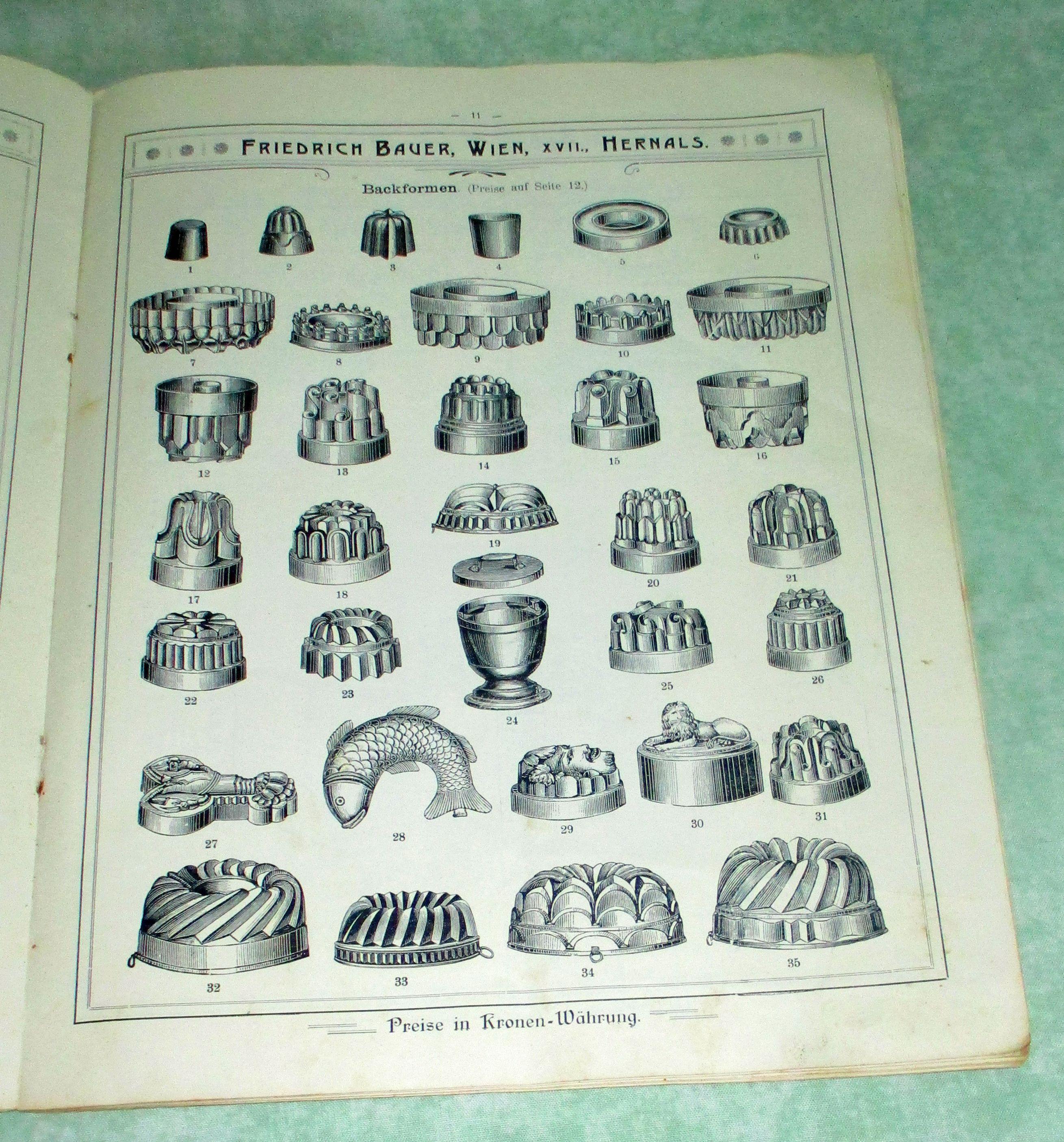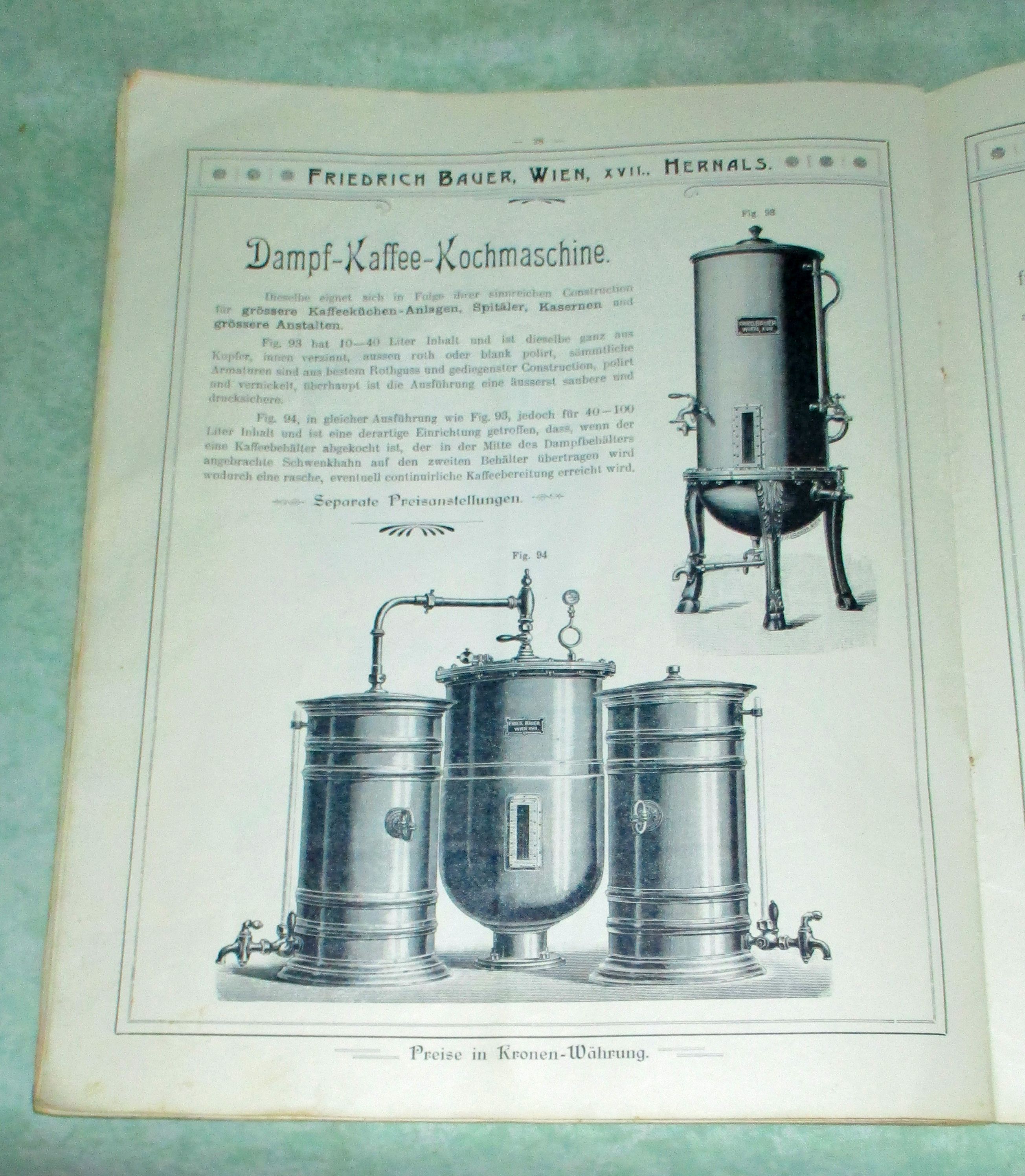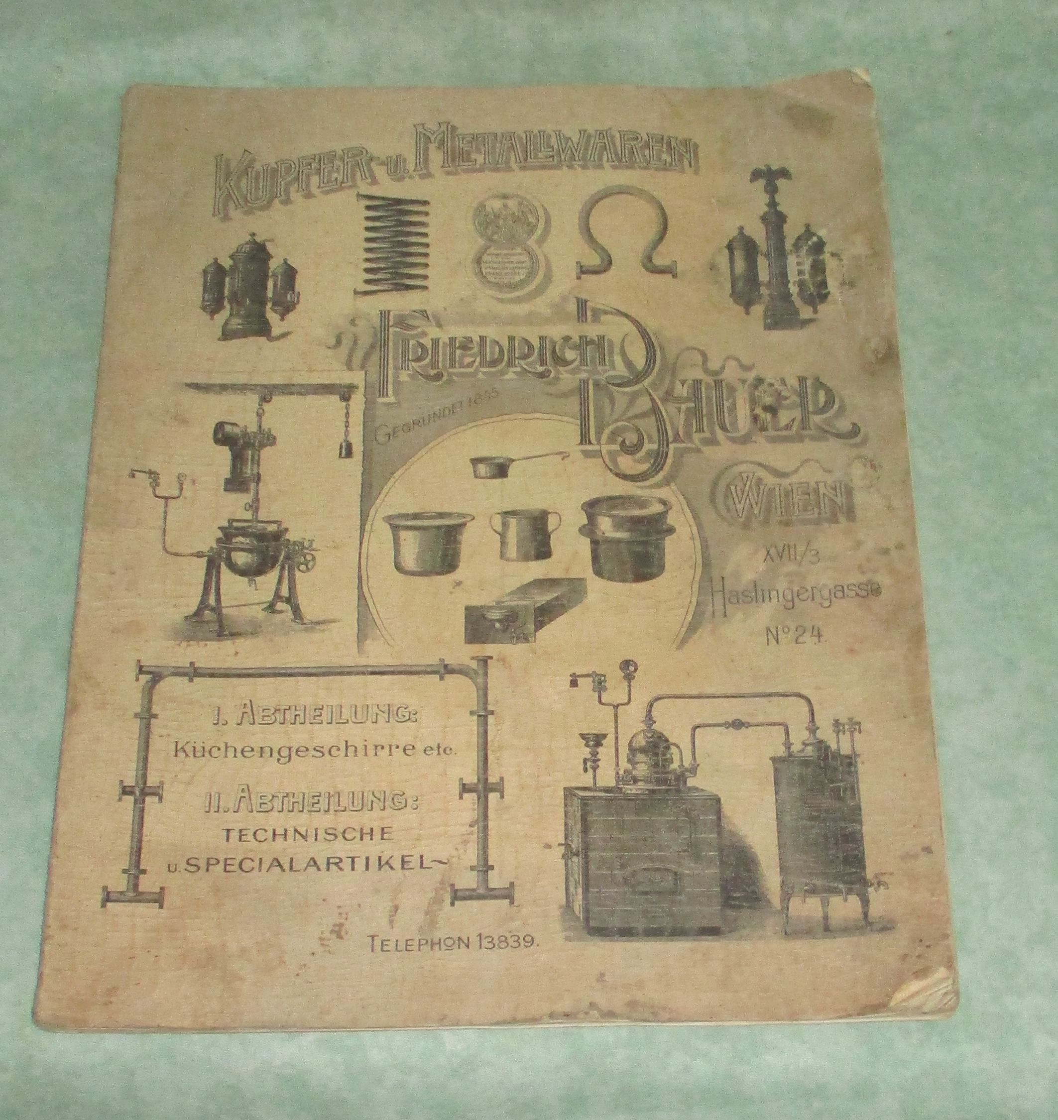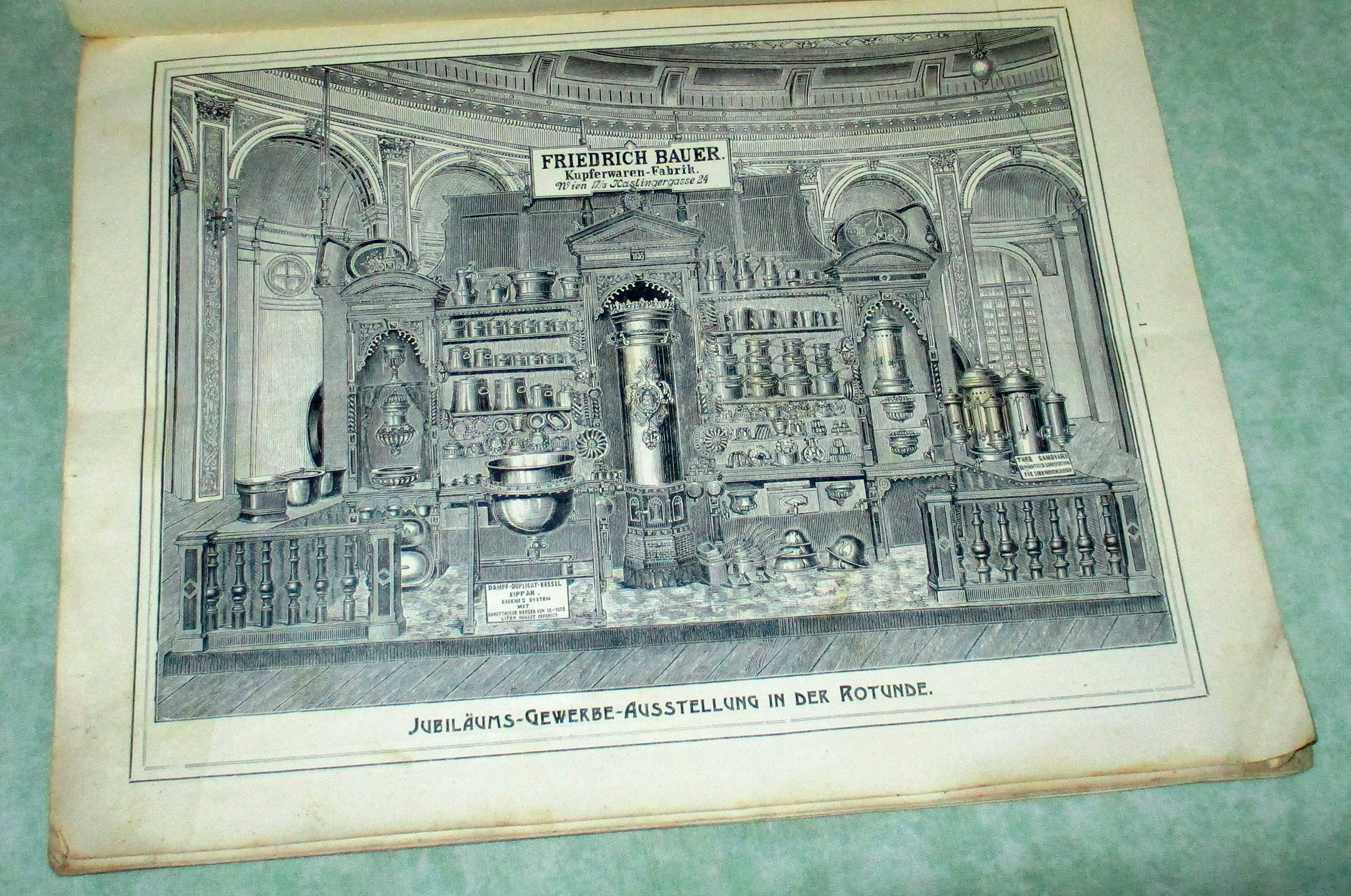Firmengeschichte + Firmenkataloge Friedrich Bauer – Kupfer- und Metallwaren. Wien XVII/3 Haslingergasse Nr. 24. I. Abtheilung: Küchengeschirre etc. II. Abtheilung: Technische und Special-Artikel. Wien. Um 1890. 30 x 23 cm. 32 Seiten. Frontispiz: Bildnis vom Stand der Fa. Bauer in der Rotunde bei der Jubiläums-Gewerbeausstellung 1888. Äußerlich stark staubfleckig.Innen sauber. Inhalt u.a.: Kochgeschirre, Backformen, Kaffeehauskücheneinrichtungen, Waschkessel, Theekessel, Samovare, Schanksäulen, Badeöfen, Dampfkochkessel, Dampf-Kaffee-Kochmaschine. Destillir-Apparate