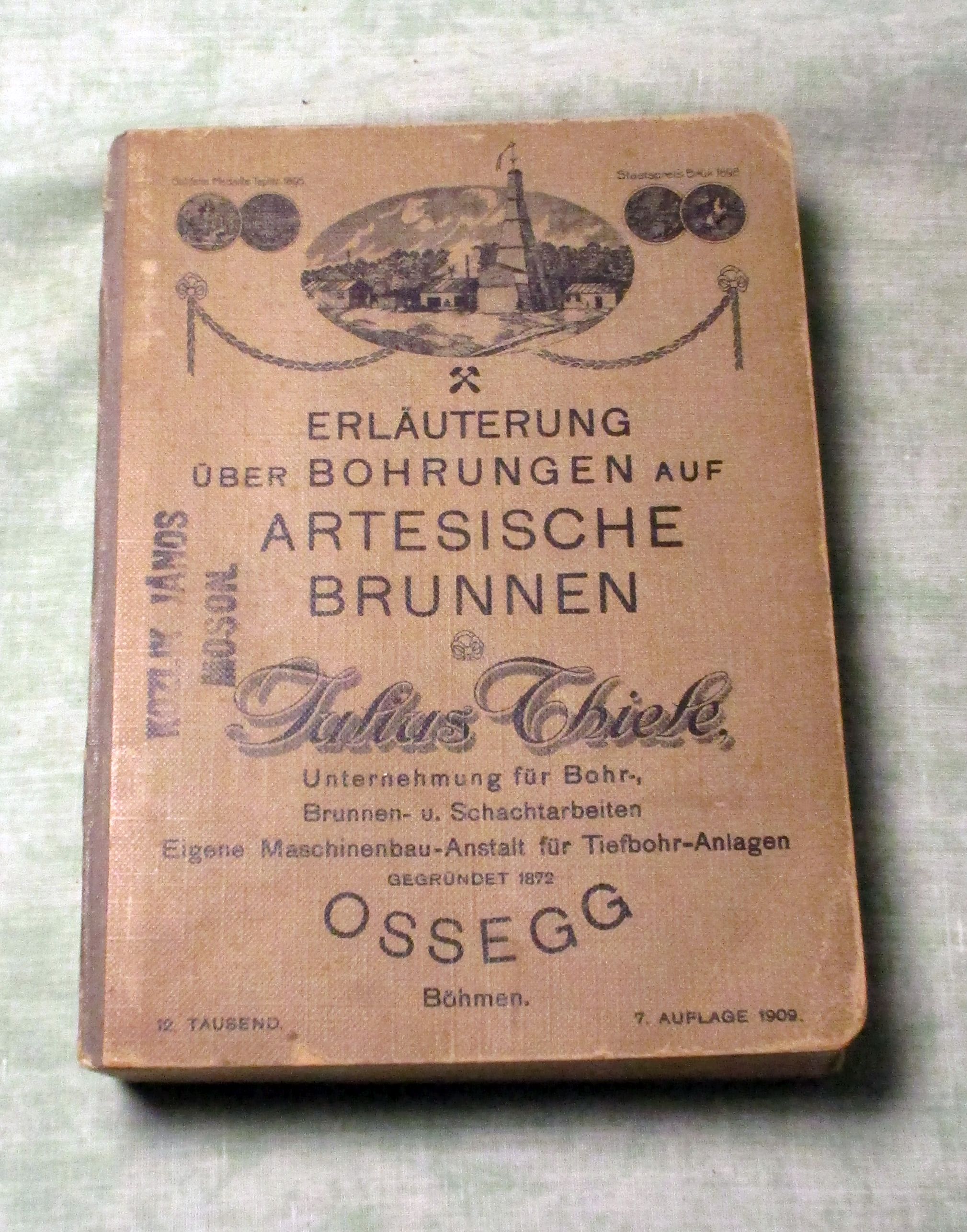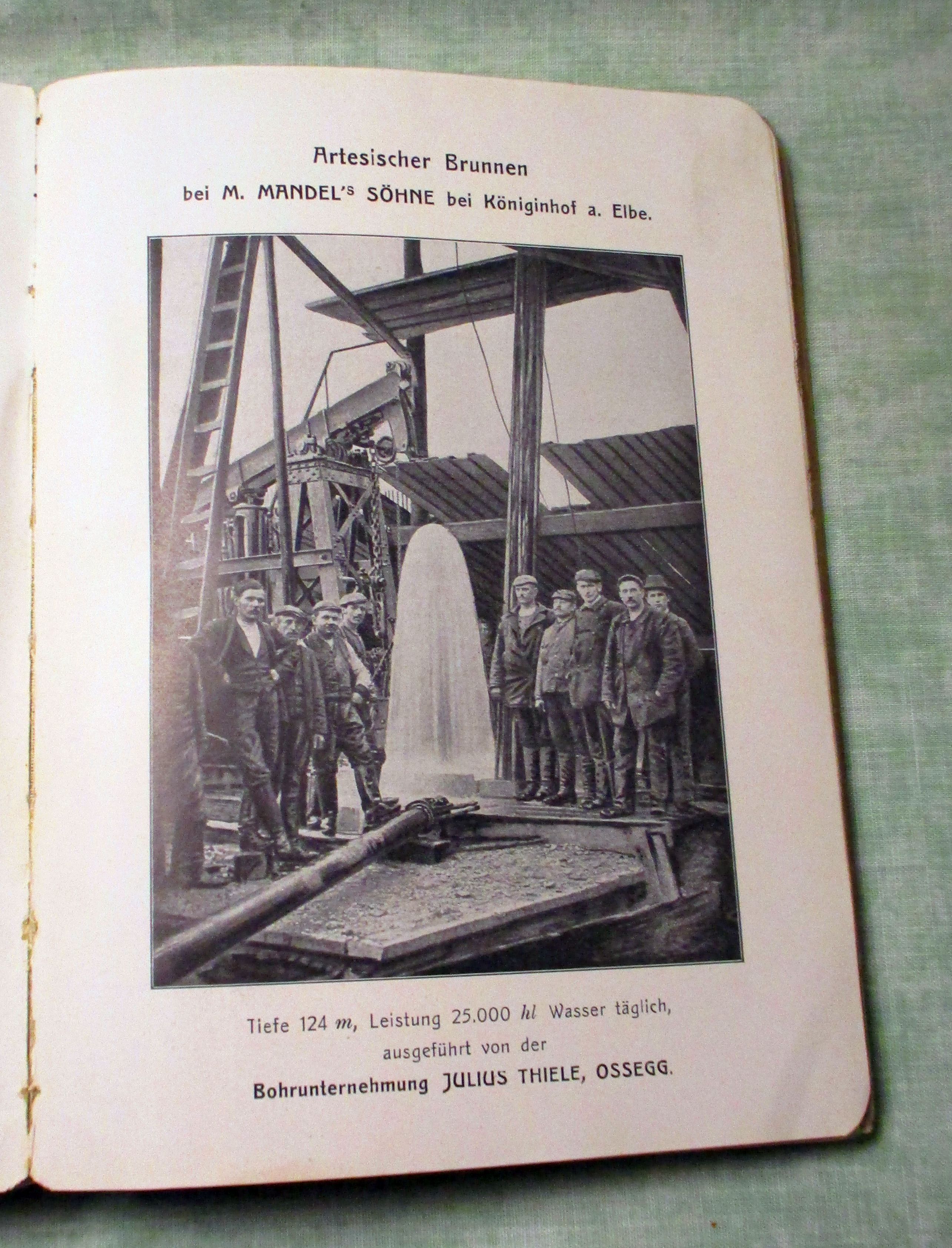 Firmengeschichte + Firmenkataloge Julius Thiele – Unternehmung für Boht- Brunnen- u. Schachtarbeiten. Eigene Maschinenbau-Anstalt für Tiefbohr-Anlagen. Gegr. 1872. Erläuterung über Bohrungen auf artesische Brunnen. 7. Auflage. Osseg – Böhmen. 1909. V. 435 Seiten, 14 Fotos von Bohrungen mit den technischen Angaben. 2 ausklappbare Pläne (Brunnen für die Stadt Lemberg). Halbleinen. Geringe Gebrauchspuren – insgesamt ein sher gutes Ex. Beschrieben werden die Bohrungen für zahlreiche Städte (beginnend mit einer Bohrung 1838 am Wiener Getreidemark) Bohrungen für Firmen vor allem in Böhmen und Mähren, aber auch in Wien, Niederösterreich, Sachsen usw. (Brauereien, Textil-, Zucker-, Papierfabriken usw.) Im Anhang ein Verzeichnis der Firmen (mehrere hundert) für die Bohrungen durchgeführt wurden. Verzeichnis der Städte (Auswahl). Proßnitz, Neusatz, Braunau in Böhmen, Teplitz-Schönau, Klattau, Esseg, Brünn usw.