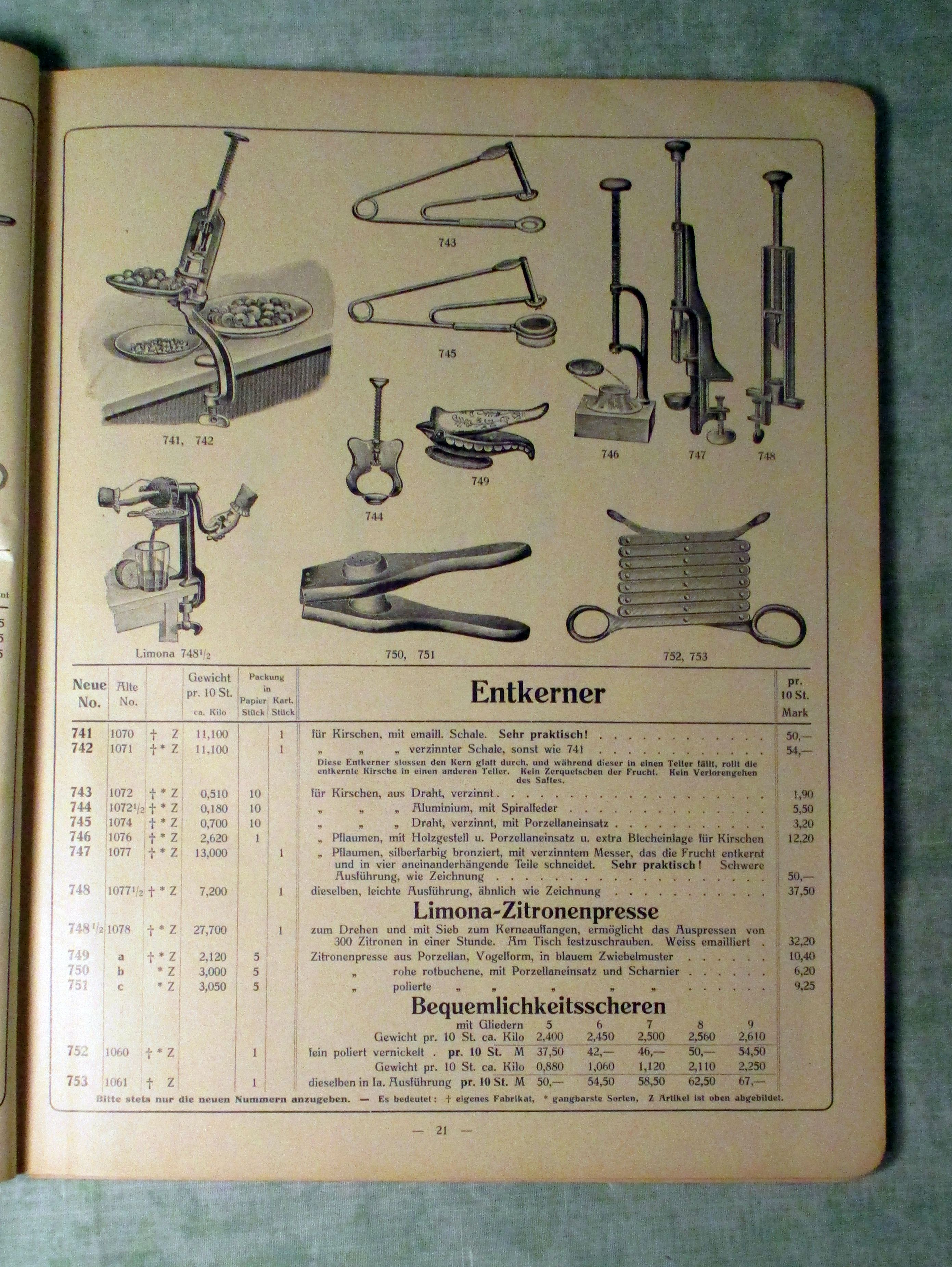 Firmengeschichte + Firmenkataloge Preis-Liste von Otto Klett, Benshausen in Thüringen. Eisenwaren-, Werkzeug- und Haushaltungsartikel-Fabrik mit Dampfbetrieb. Abteilung I: Spezialartikel eigener Produktion. Abteilung II: Kurzwaren des Schmalkalder Industriebezirks. Massenfabrikation von Bullenringen, Bullenzangen, Pfeffermühlen, Dosenöffnern, Nussknackern, Pinzetten, Schuhknöpfern, Sägenschränkeisen, Fruchtstechern, Käsebohreren, Körnern, Durchschlägern, Nagelteribern, Bienengeräten, Nagelfeilen, Apfelstechern, Kartoffellöffeln und vielen anderen Artikeln. Um 1920. 184 Seiten, durchgehend illustriert. kart. In sehr gutem Zustand,